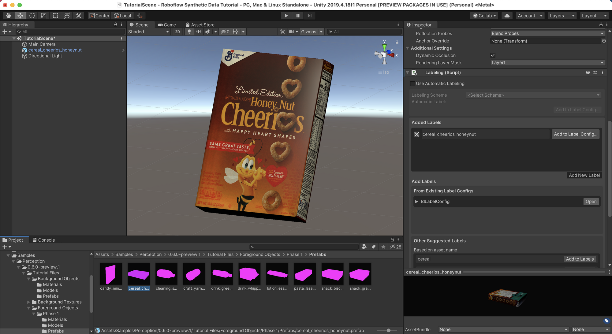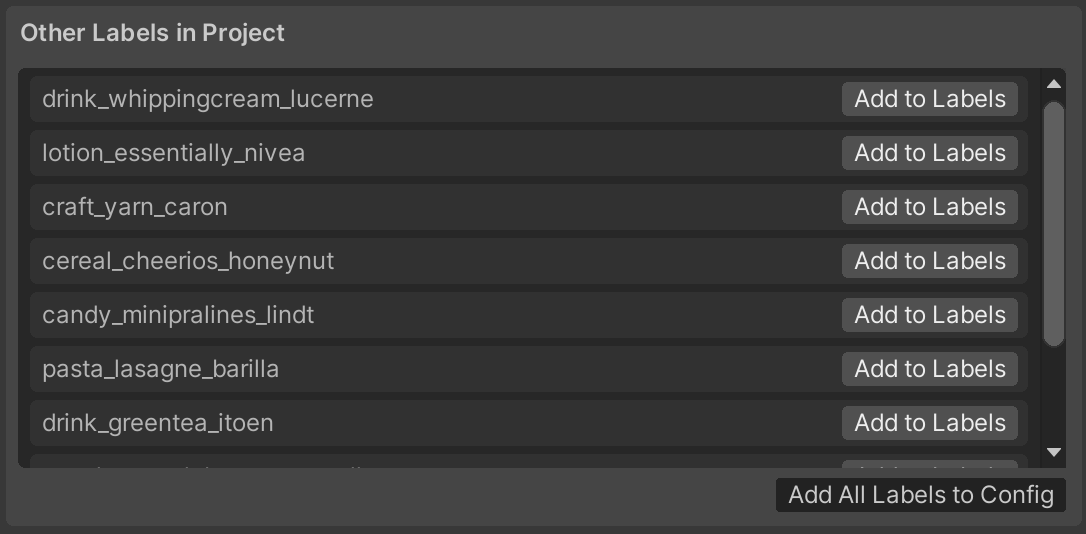 If you'd like to assign different labels to the objects, find the foreground Prefabs in the project navigator and focus them into the Inspector. Some examples might be calling them all product or labeling them as breakfast, lunch, or dinner foods. Creating new prefabs and applying labels is also how you would setup your own 3D models as objects of interests.