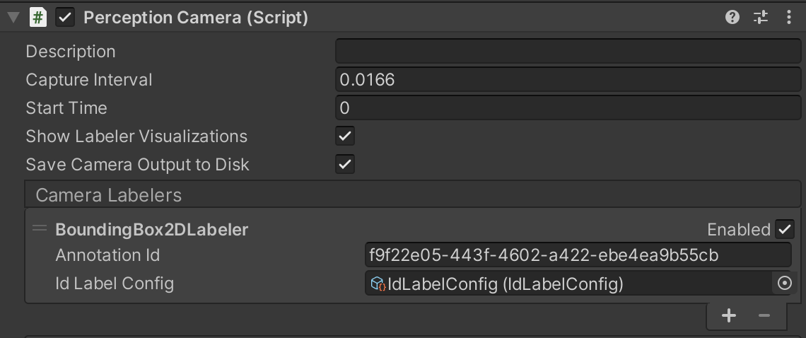 Next we need to configure this camera to label our objects' ground truth from its point of view. To do this, click the + in the Perception Camera's Camera Labelers section and choose BoundingBox2DLabeler.