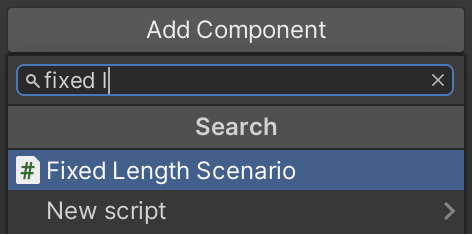 Then click on Scenario 1 to focus it in the Inspector and click Add Component then search for Fixed Length Scenario.