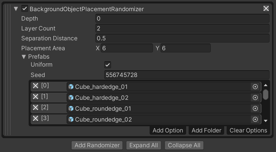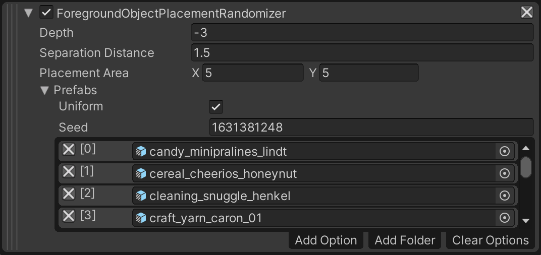BackgroundObjectPlacementRandomizer- spawns randomly selected objects (from a given list) and places them at random positions.TextureRandomizer- applies a random texture to add variety to our objects.HueOffsetRandomizer- randomly alters the colors of our objects.ForegroundObjectPlacementRandomizer- exactly the same asBackgroundObjectPlacementRandomizer(but with a different list of items). We need two separately namedRandomizers because aScenariocan only contain a single instance of a givenRandomizer.RotationRandomizer- orients both our background and foreground objects randomly.