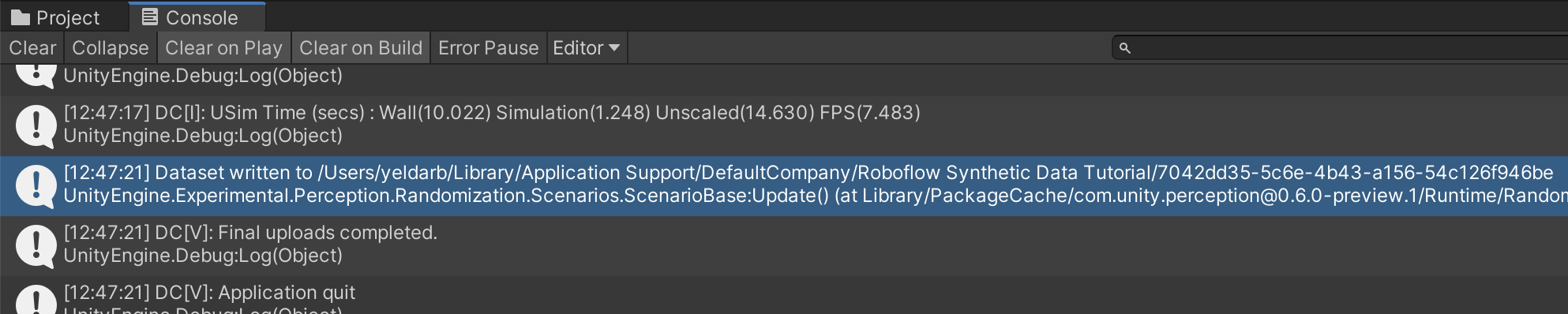 The line you're looking for looks something like this (my files were stored in ~/Library/Application Support/DefaultCompany/Roboflow Synthetic Data Tutorial with a separate folder for each simulation run):