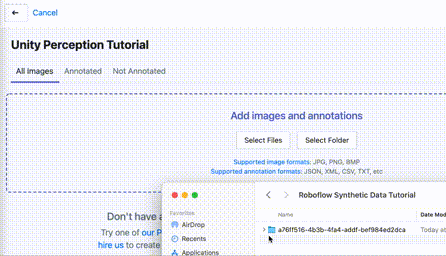 These files are stored in a proprietary Unity Perception JSON format. But, luckily, Roboflow supports importing and converting these files for use with any standard computer vision model. Simply sign up for a free Roboflow account, create a dataset, and drop in the generated folder to the upload screen.