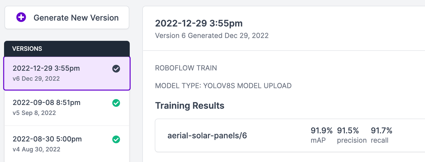 Now that we have our data in Roboflow, we can create a dataset version. To do so, go to the “Versions” page on the Roboflow dashboard and generate a new version with any augmentations and preprocessing steps that you want to apply. After clicking the “Generate” button, your new version will be created: