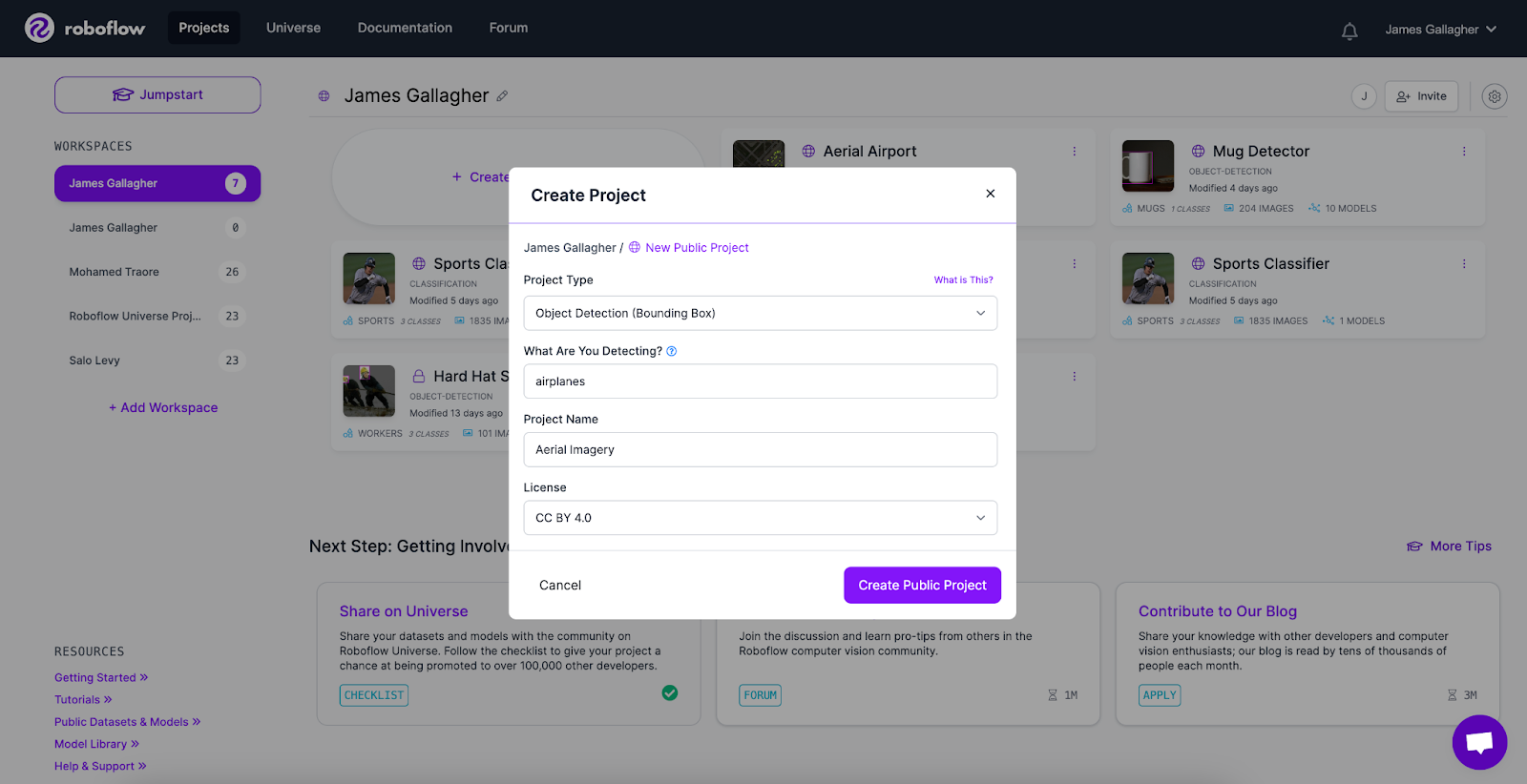 Next, go to the Roboflow dashboard and create a new project. Let’s call the project “Aerial Imagery”.
