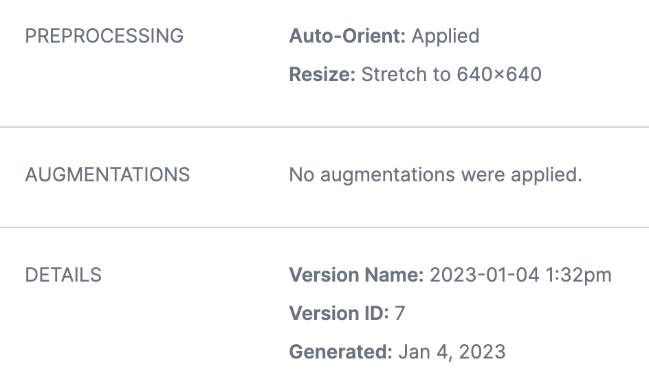 If you have uploaded your own data manually, without using our Python package, you can retrieve your dataset version number by going to the Roboflow dashboard. Select a version of your model and then note the number that appears in the “Version ID” section of the “Details” list on your model version page.