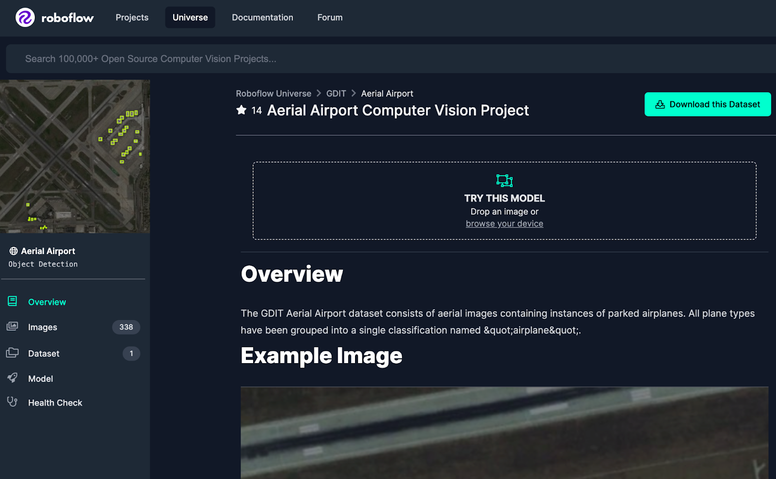 First, we need to prepare a dataset that we can use to train our model. We’ll need to create a version of our dataset in Roboflow to which we can upload model weights in Python. In this tutorial, we'll use the “Aerial Airport” dataset that is publicly available on Roboflow Universe, a repository of over 110,000 open source computer vision datasets.