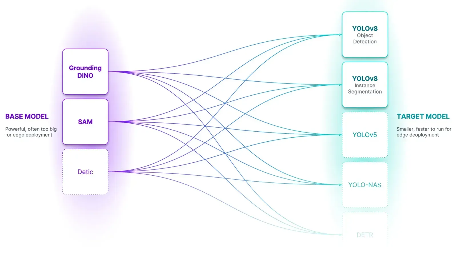 Roboflow is building Autodistill, an open source tool for using large, foundation vision models to train smaller, task-specific models. With Autodistill, you can use common foundation models such as Grounding DINO, SAM, and CLIP and connect them with popular models for use in training like RF-DETR and ViT.