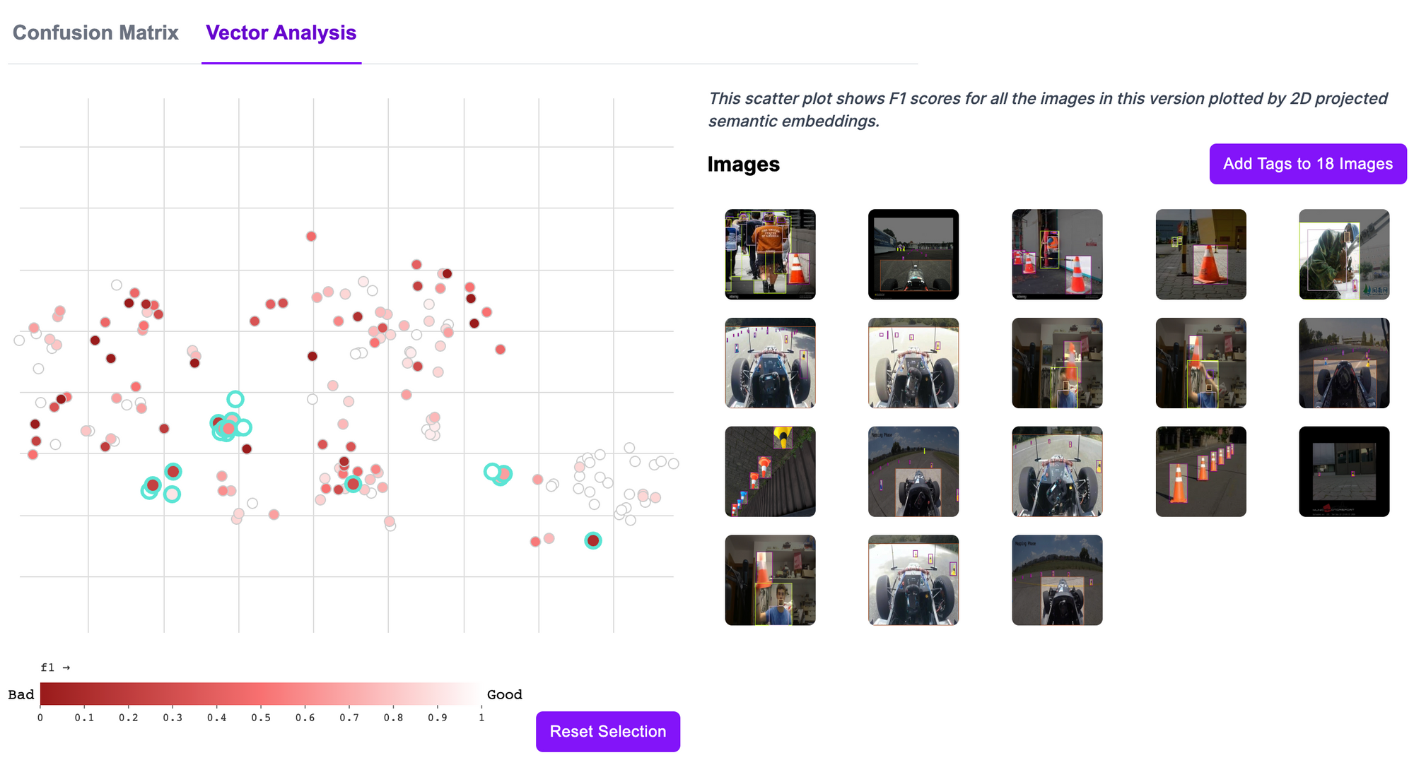 Roboflow has an in-app vector analysis tool you can use to understand model performance across images in your test dataset. The vector analysis tool is powered by CLIP, allowing you to see performance grouped into clusters by the semantic similarity of images.