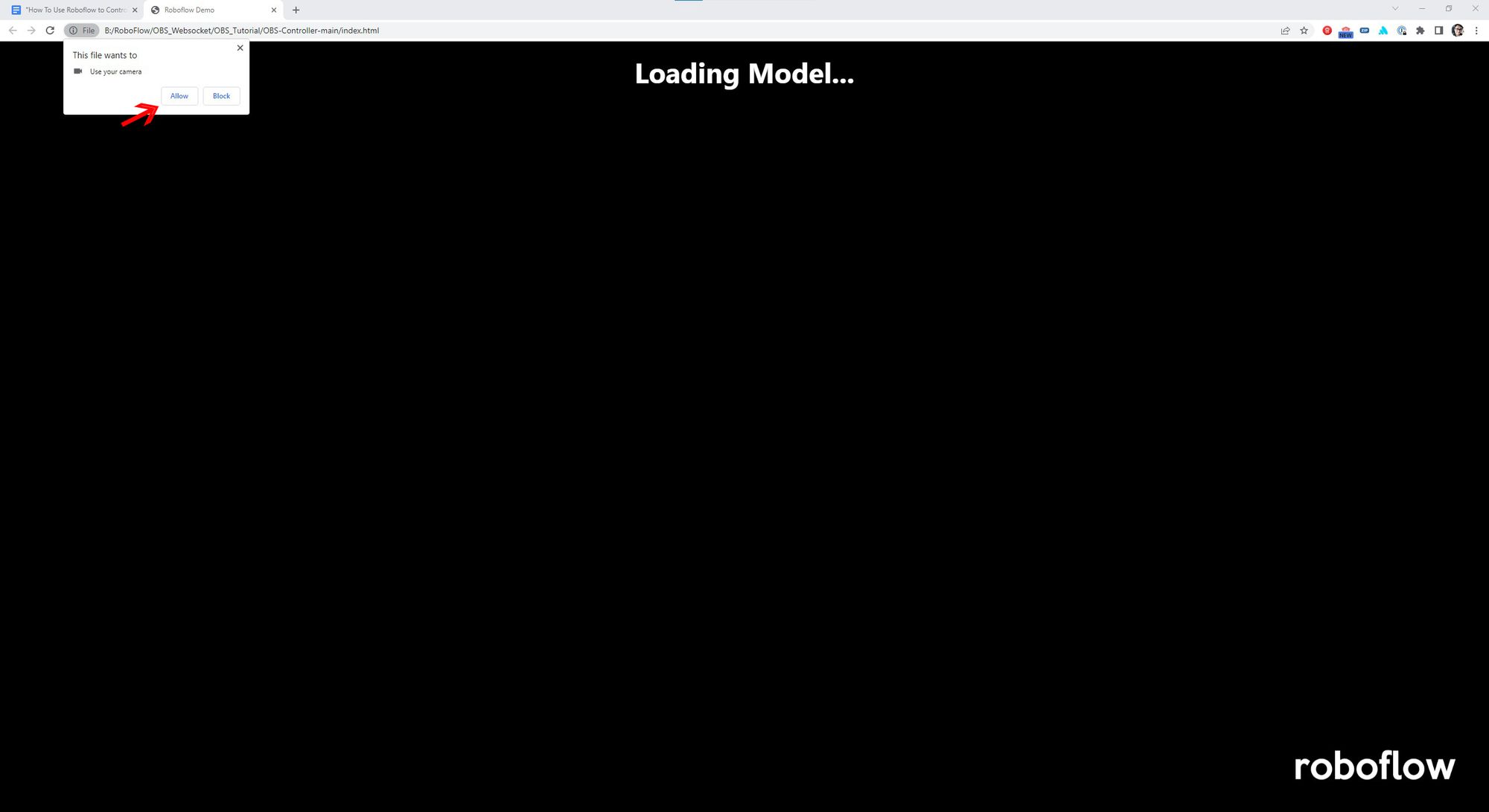 Navigate back to your "OBS-Controller-main" folder and double click index.html. This will open roboflow.js in your favorite web browser. For this tutorial we are using Google Chrome. Allow Google Chrome to access your cameras by clicking the "Allow" button.