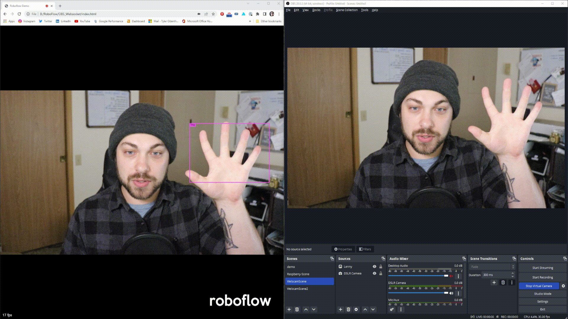 So instead of buying a stream deck or powerpoint remote, what if you could train an AI to help you control OBS? Well, good news, by using Roboflow.js and the OBS Websocket, we can use gestures to control the scenes and sources of OBS.