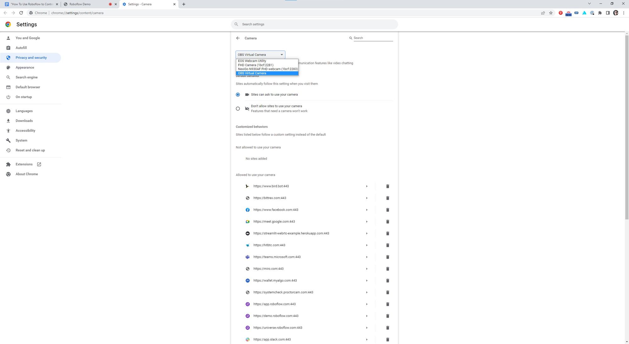 Once inside the camera section of Chrome we can establish a primary input. For the OBS controller to work, we need this set to "OBS Virtual Camera" which will let roboflow.js access the virtual camera.