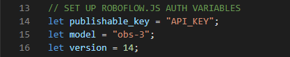 With your copied API Key, navigate back to roboflow.js and add it inside the double quotes on LINE 14. If you want to try the gesture controller model that was used in this tutorial you can find it here on Roboflow Universe. The model ID is "obs-3" which goes on LINE 15 and version number is "14" which goes on LINE 16.