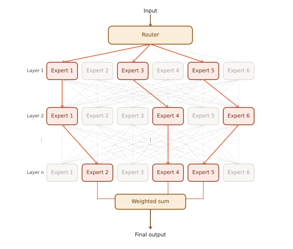 In sparse MoE models, only a subset of the model’s parameters, called experts, is activated. A gating network or router determines which experts are activated. This mechanism allows a complex task to be divided into simpler subtasks, each handled by smaller, specialized networks.