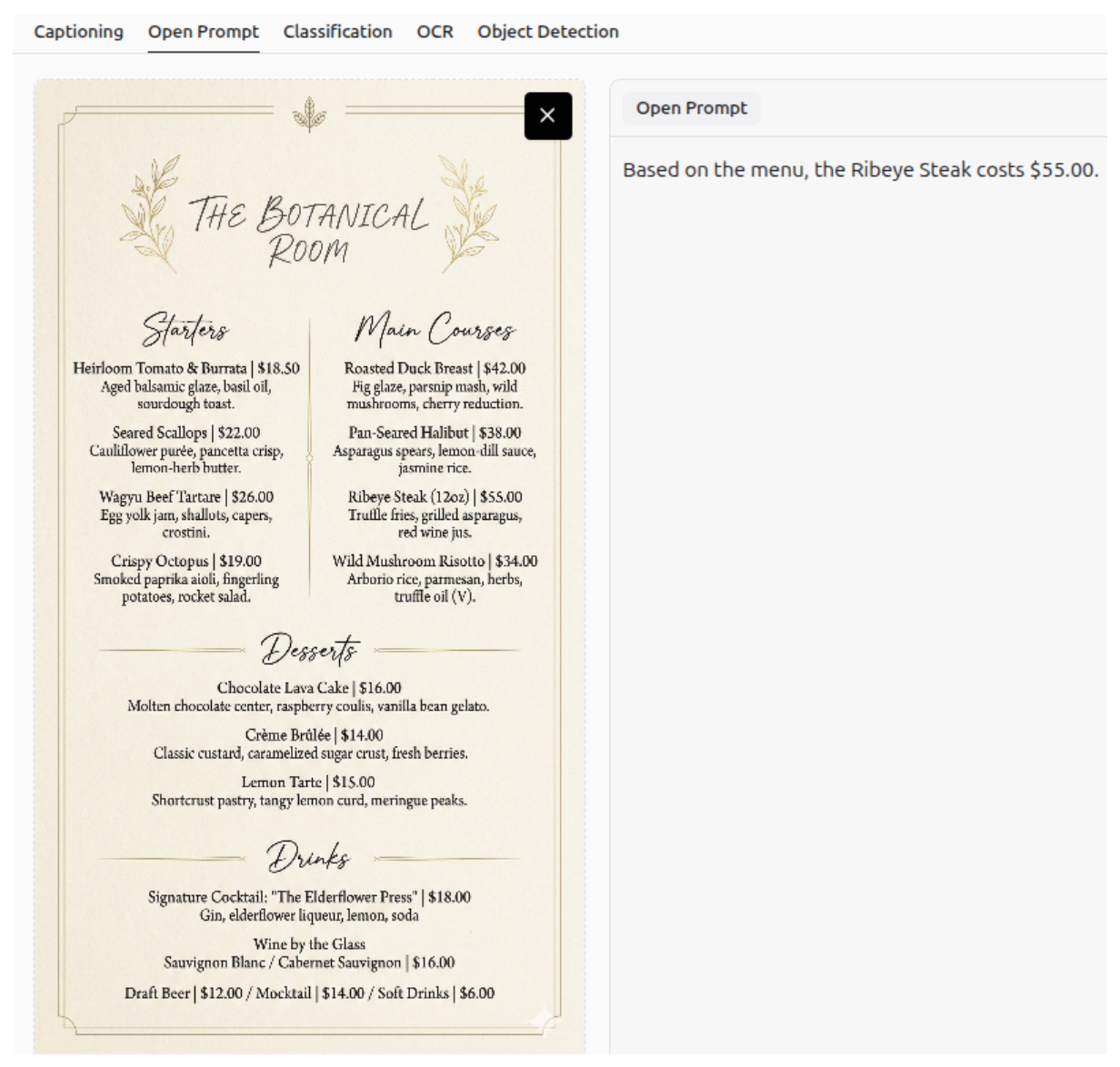 Visual Question Answering (VQA), often referred to as an open prompt task, is a computer vision task where a model analyzes an image and answers questions about its content in natural language. It combines image and language understanding to interpret visual details, context and relationships within the scene.