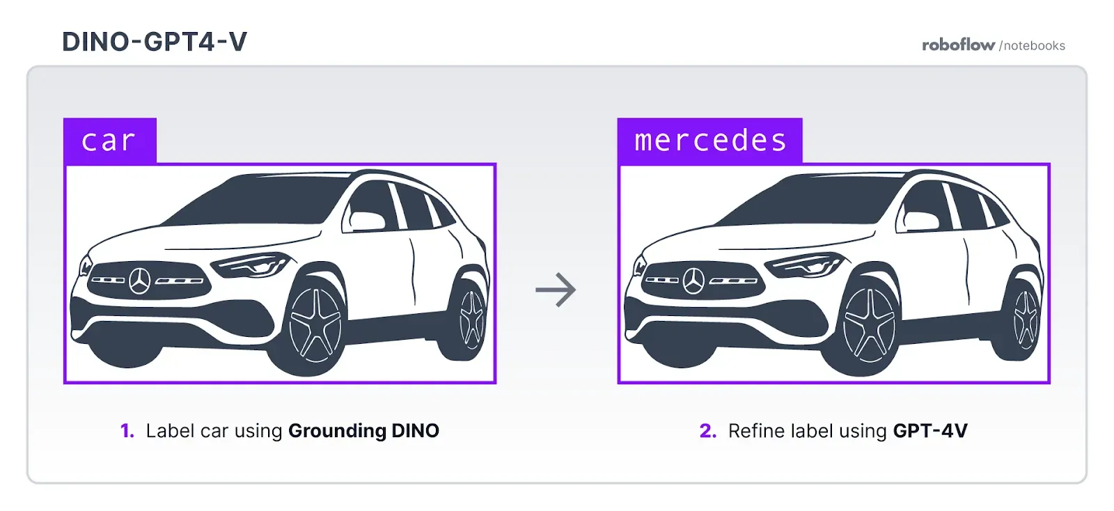 Consider a scenario where you want to label car brands for use in building an insurance valuation application that uses computer vision. You could use Grounding DINO to identify cars in images, then GPT-4 to identify the exact brand of the car (i.e. Mercedes, Tesla). A fine-tuned model will run faster than GPT-4 or Grounding DINO, can be deployed to the edge, and can be tuned as the needs you want to address with vision evolve.