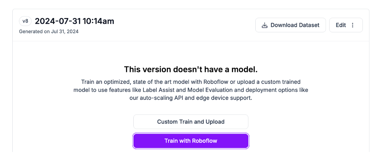 To train a model, first create a project on Roboflow and generate a dataset version. Then, click “Train with Roboflow” on your dataset version dashboard: