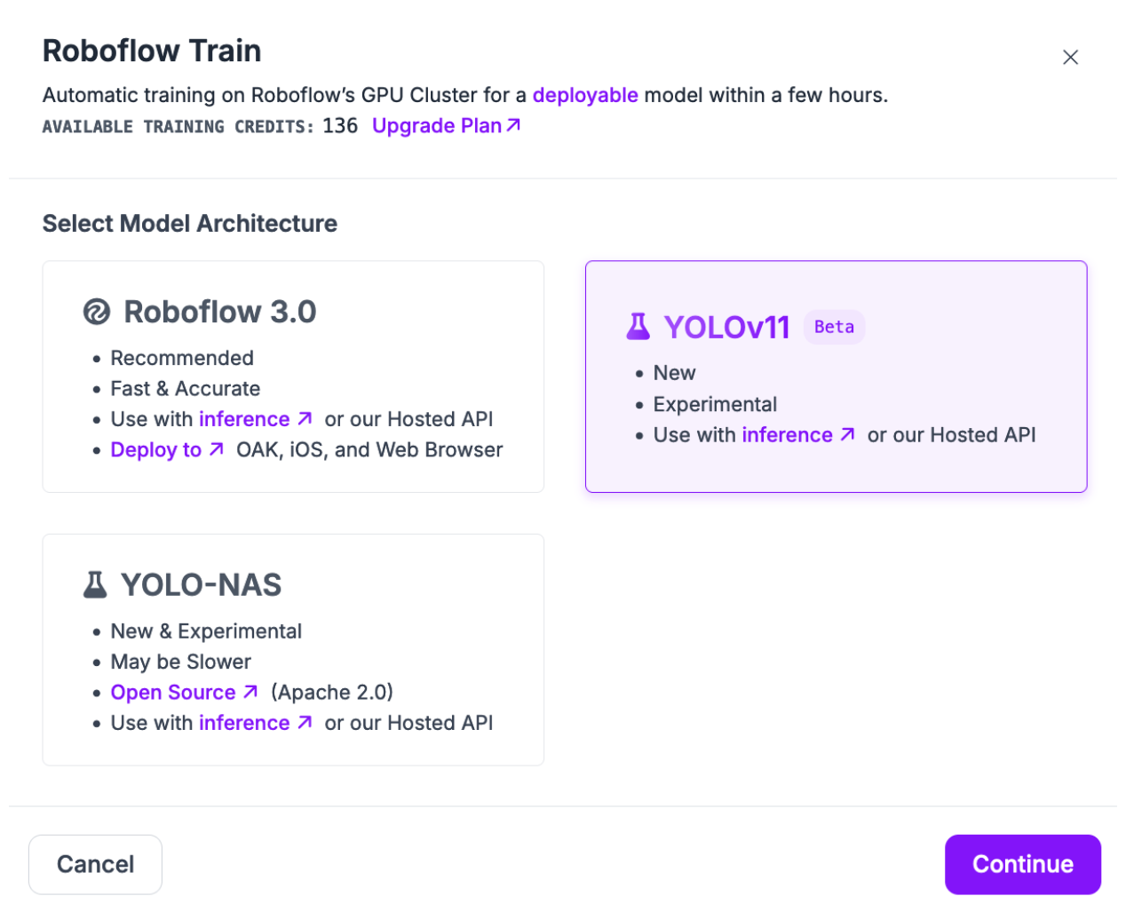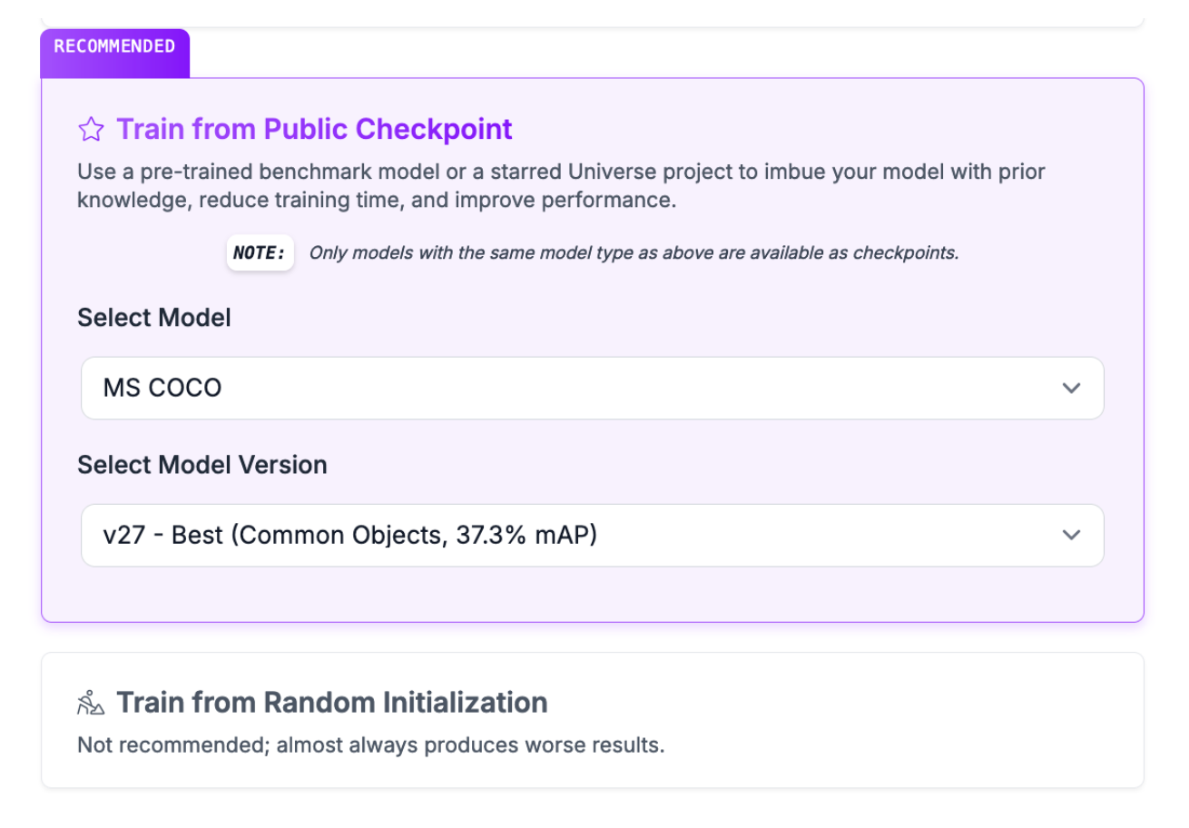 You will then be asked from what training checkpoint you want to start training. By default, we recommend training from our YOLO11 COCO Checkpoint. If you have already trained a YOLO11 model on a previous version of your dataset, you can use the model as a checkpoint. This may help you achieve higher accuracy.