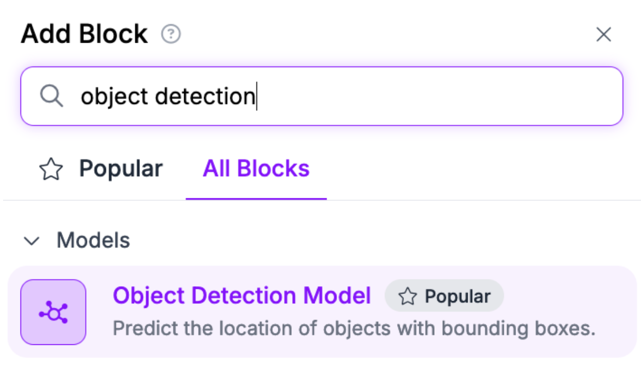 Click “Add a Block” to add a block. Then, add an Object Detection Model block.