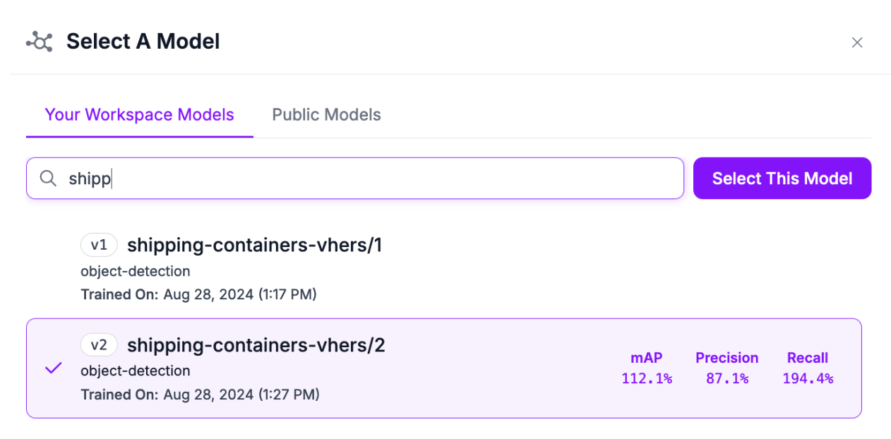 You will then be taken to a panel where you can choose what model you want to use. Set the model ID associated with your YOLO11 model. You can set any model in your workspace, or a public model.