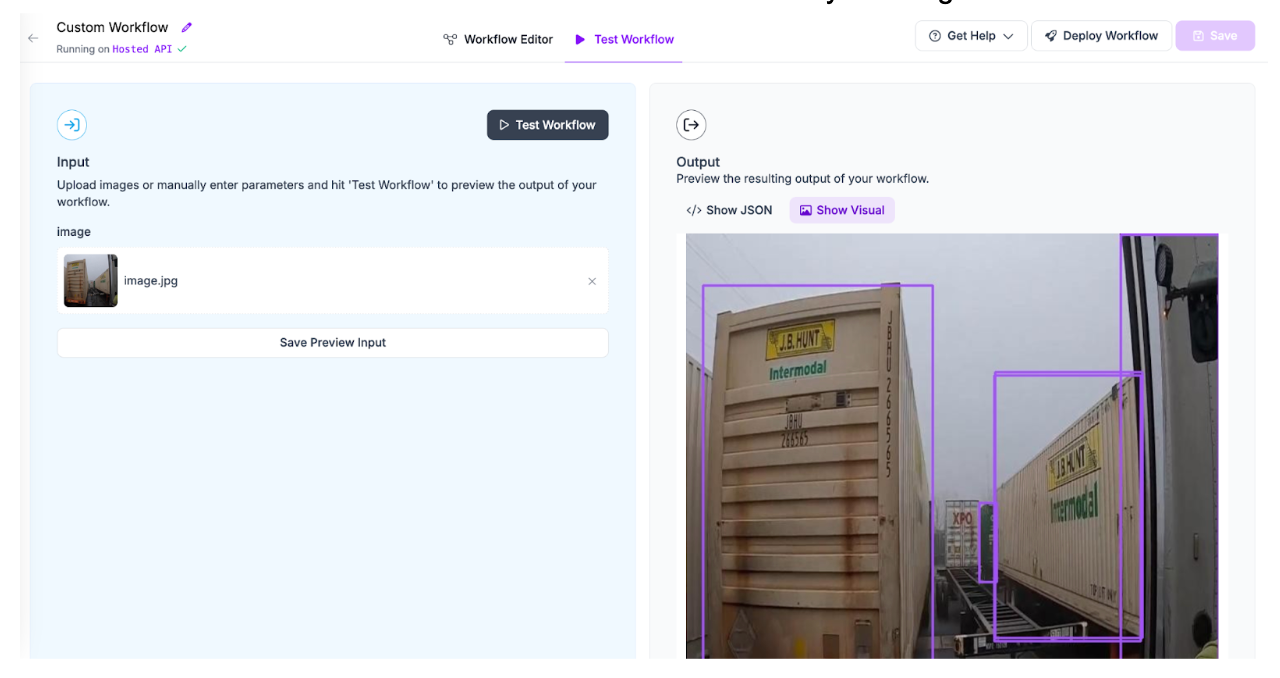 To test your Workflow, click “Test Workflow”, then drag in an image on which you want to run inference. Click the “Test Workflow” button to run inference on your image: