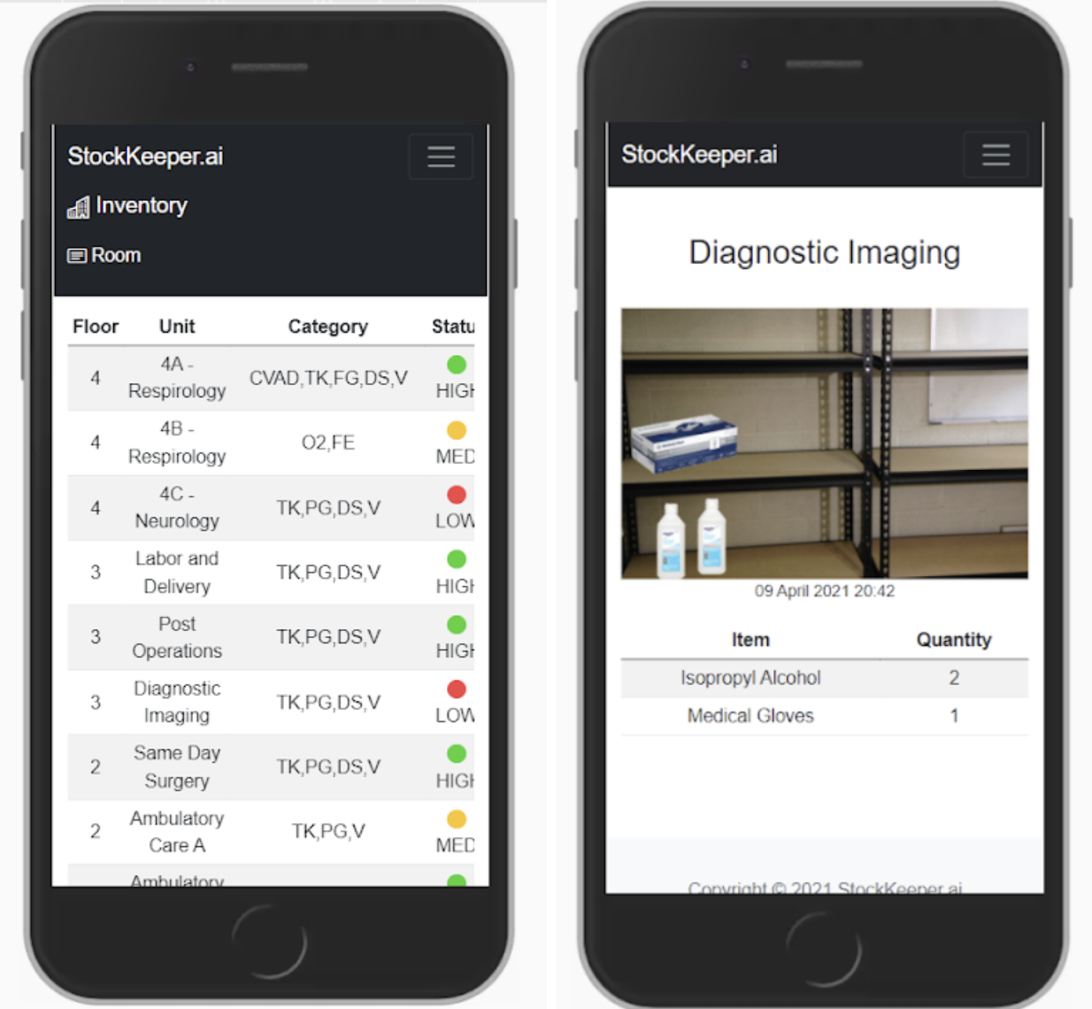 The prototype consisted of an object detection model recognizing supplies and their quantities plus a responsive front-end. The user can click on a room to view the live photo feed of the room’s supplies, as well as a table of its supplies and quantities.
