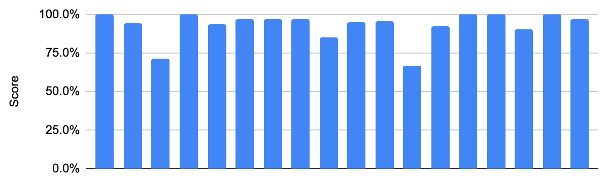 In this regard, Bard performed incredibly well, getting an average of 92.8%, with five exact matches and low variability, demonstrating its ability to consistently and accurately detect and communicate the content of an image. We didn’t test Bard on the full dataset, but the performance here is quite impressive compared to state-of-the-art model results.