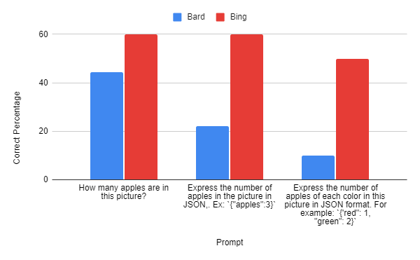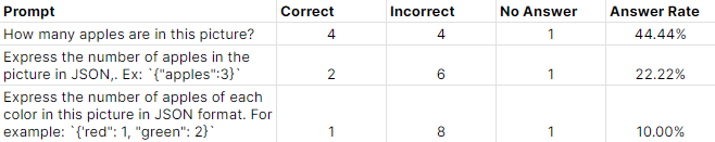 For this task, we used the apples dataset to ask Bard to count the number of apples that exist in an image. We extend this to three different prompts of increasing difficulty to assess Bard’s quantitative and qualitative deduction skills, as well as its ability to format data in a structured way.