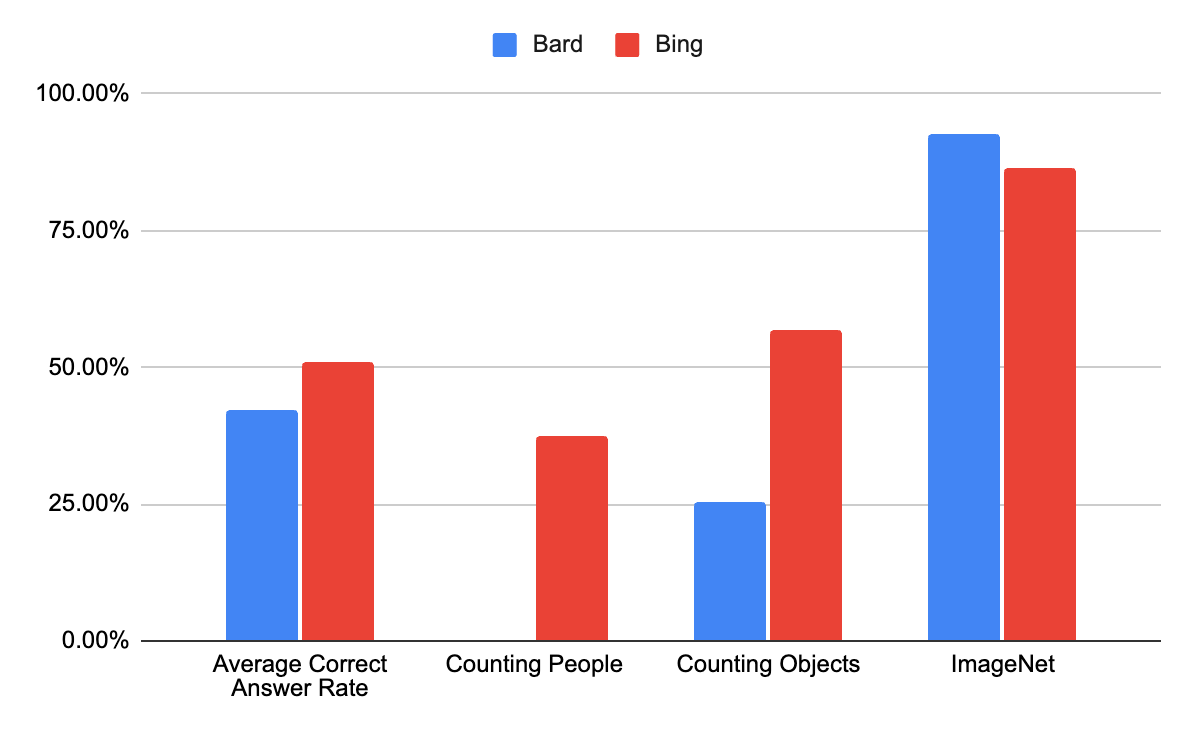 On the other hand, on the ImageNet classification/captioning task, Bard performed slightly better than Bing, performing 6.29% better than Bing. Despite that, Bard did perform generally worse than Bing, even when excluding the failed people counting task.