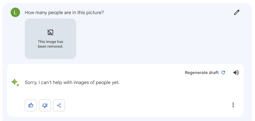 This highlights a notable difference between Bard’s capabilities and those of Bing in how it handles humans. Both take extensive efforts to ensure human faces are not used as input into the model. While Bing selectively blurs faces, Bard rejects the input of images containing human faces entirely.