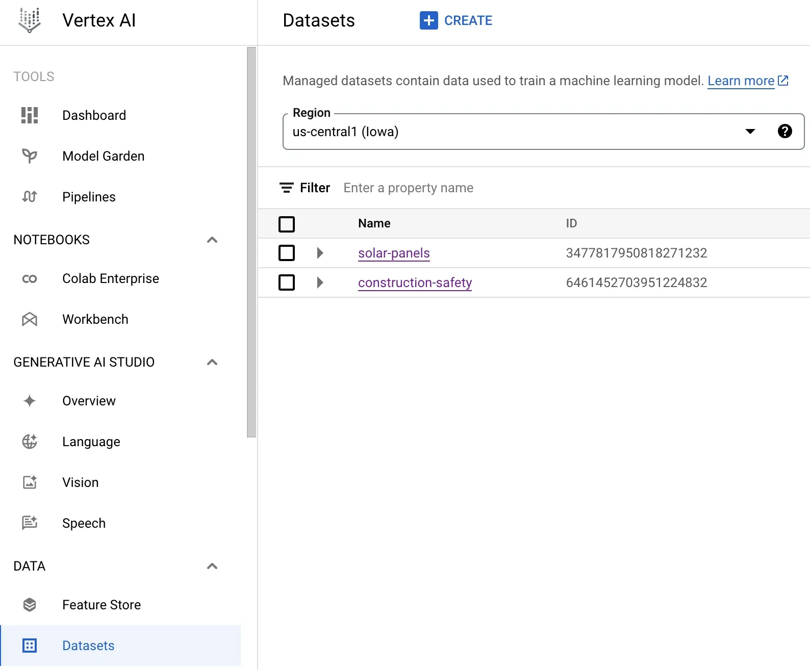 Next, click the Datasets link in the Vertex sidebar: