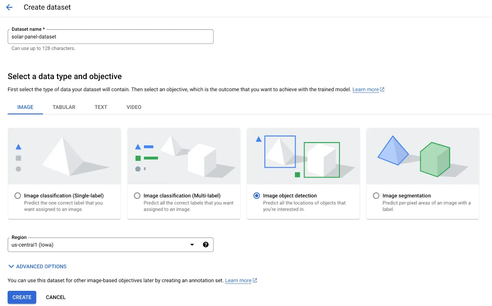 Click the “Create” button to create a dataset.