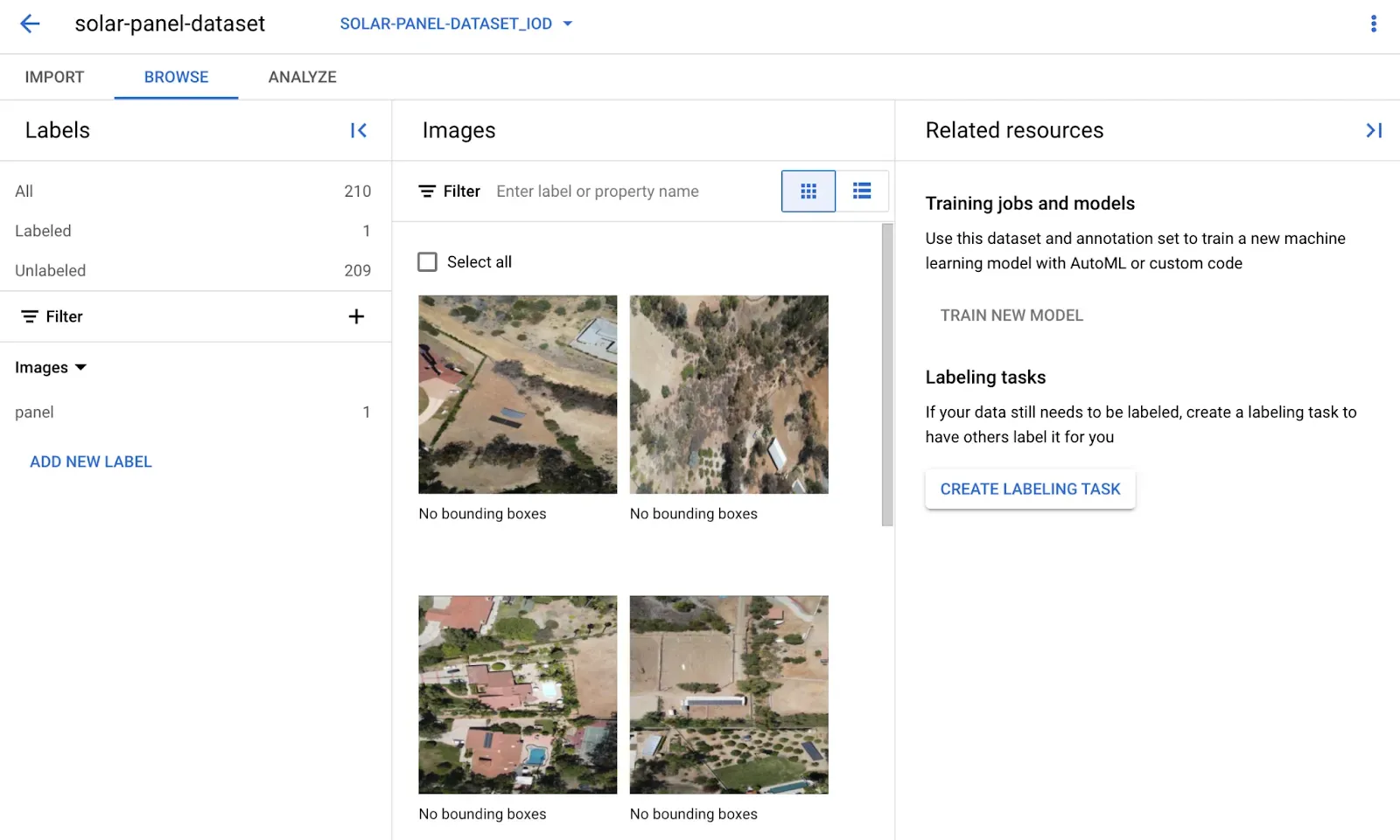 When your Dataset is ready, you will see all of your images on the Vertex AI Dataset page associated with your project: