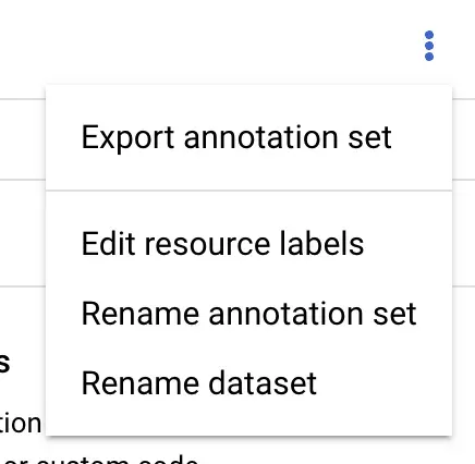 The labeled dataset can be used to train an object detection model on Vertex AI. To learn more about training a custom model on Vertex, check out our Vertex AI training guide. You can also export your data for use in training in another application. Click the three dots in the top left corner of Vertex AI and select the “Export annotation set” option: