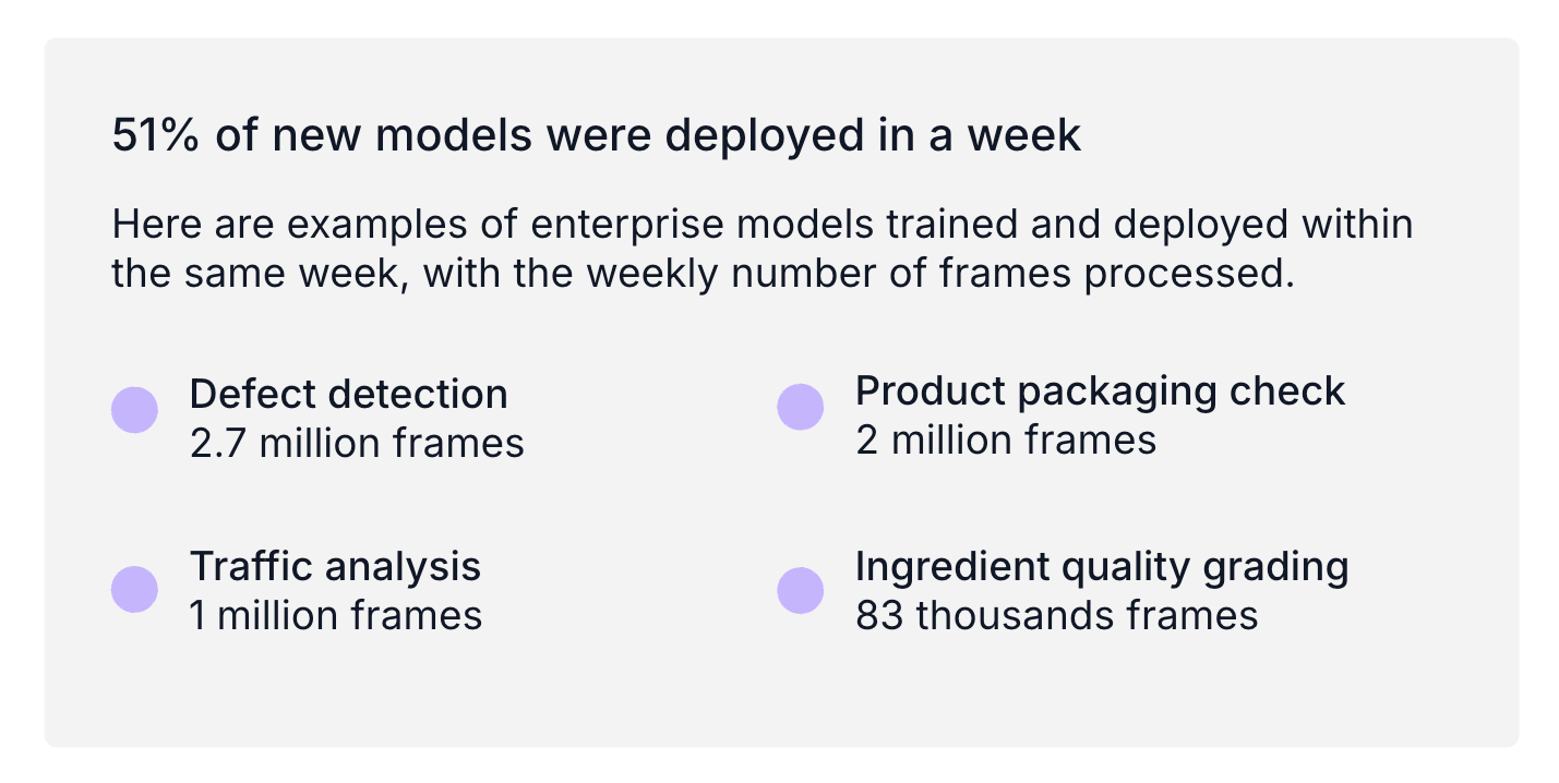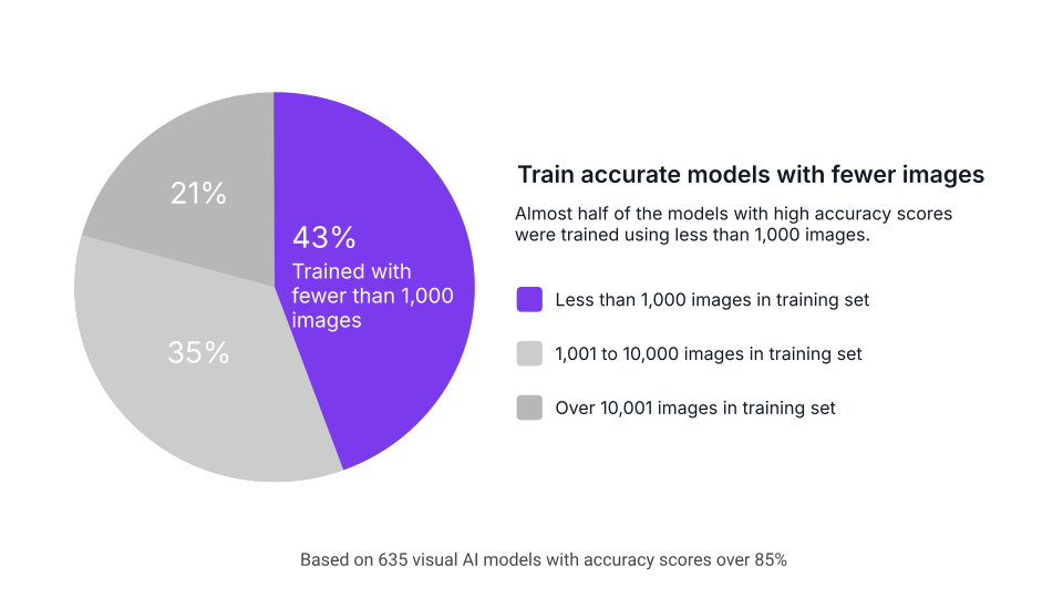 While it may sound daunting, the process of training custom AI has become significantly less data intensive. Our analysis revealed that 43% of enterprise models were trained with datasets containing fewer than 1,000 images. With just a few hundred images, businesses can develop custom AI models capable of solving specialized challenges, greatly reducing development time and cost.