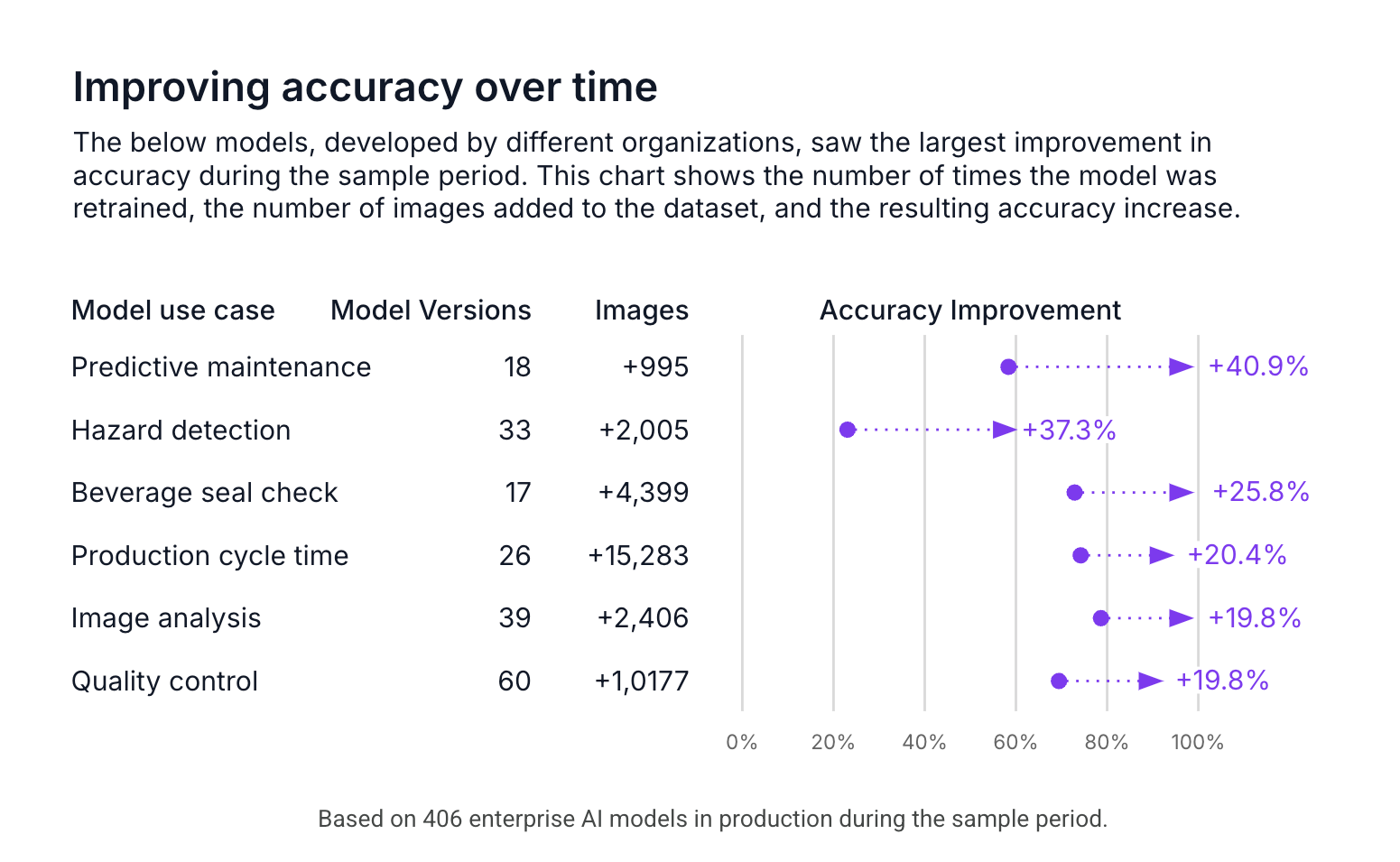 For example, the report highlights one organization that retrained their AI model 18 times during the sample period, expanding the training dataset by over 900 images and improved the accuracy 40 percentage points.