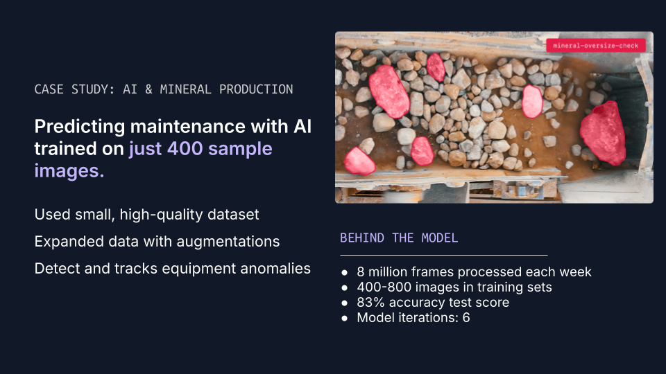 • Predictive Maintenance in Mineral Production: A global supplier of minerals and materials uses visual AI to monitor equipment condition and predict maintenance needs, reducing downtime and costs.