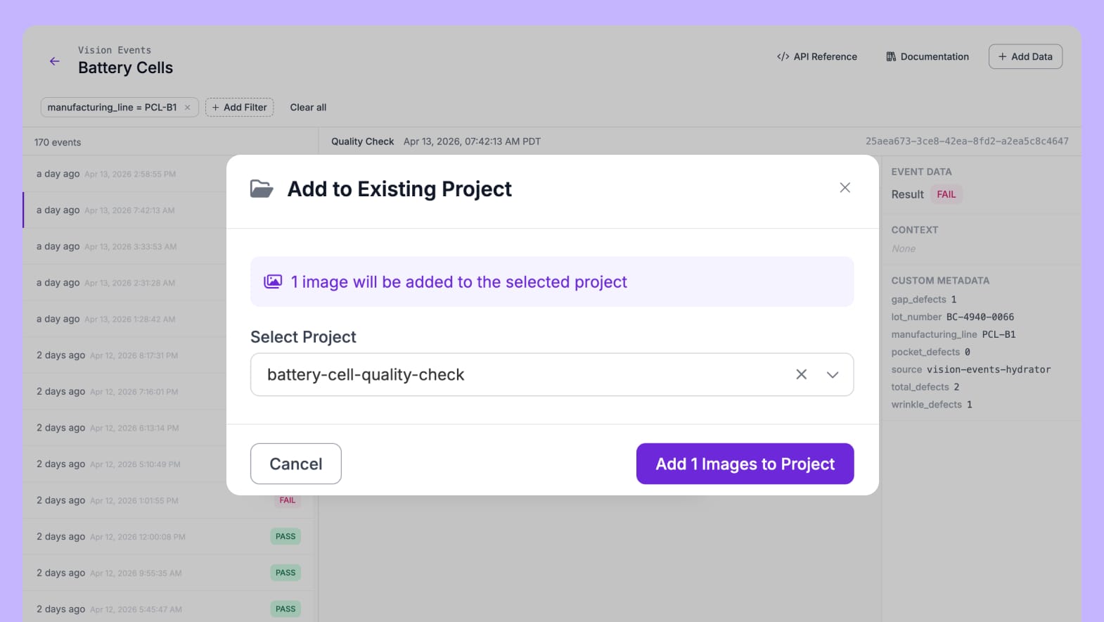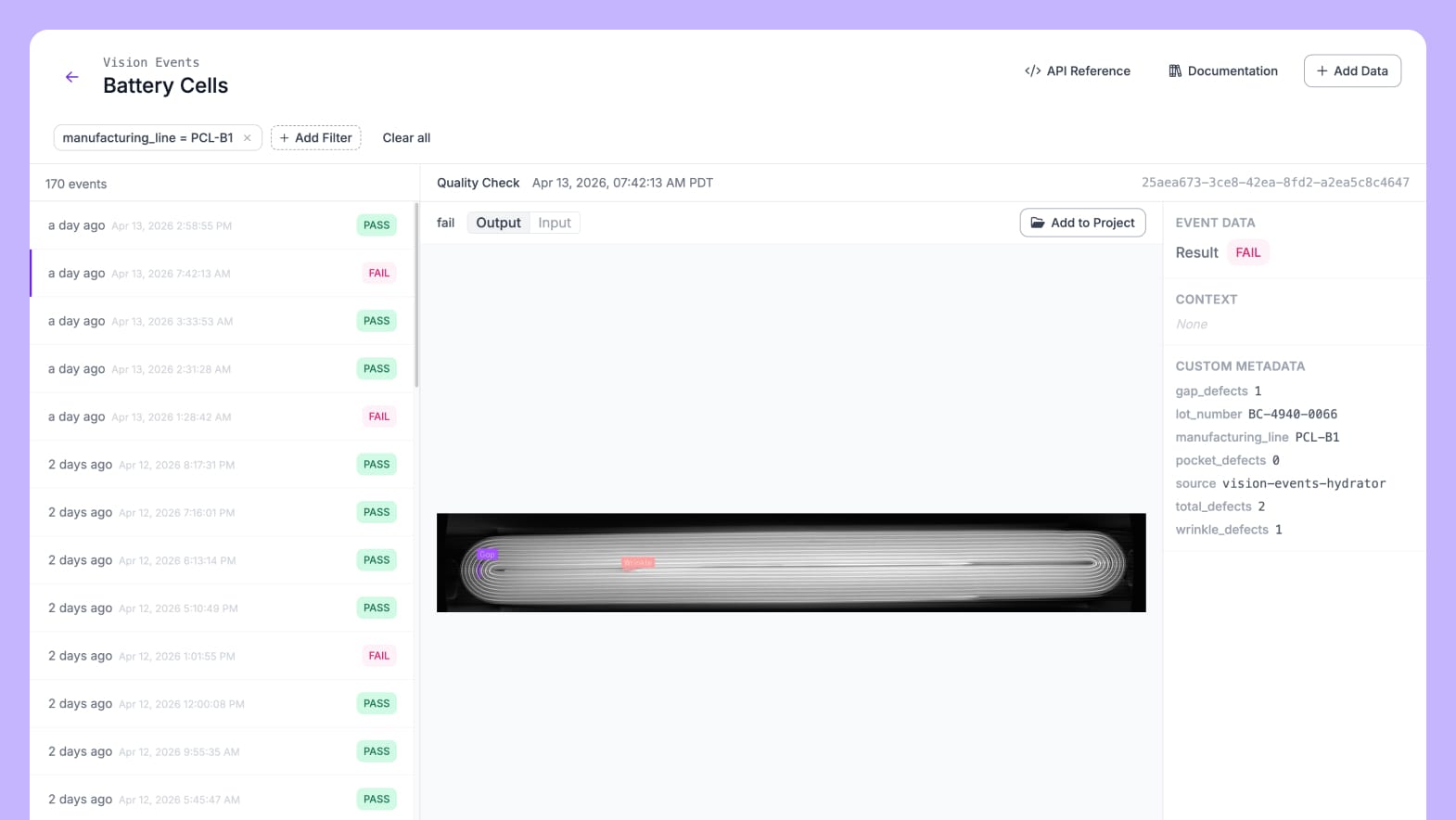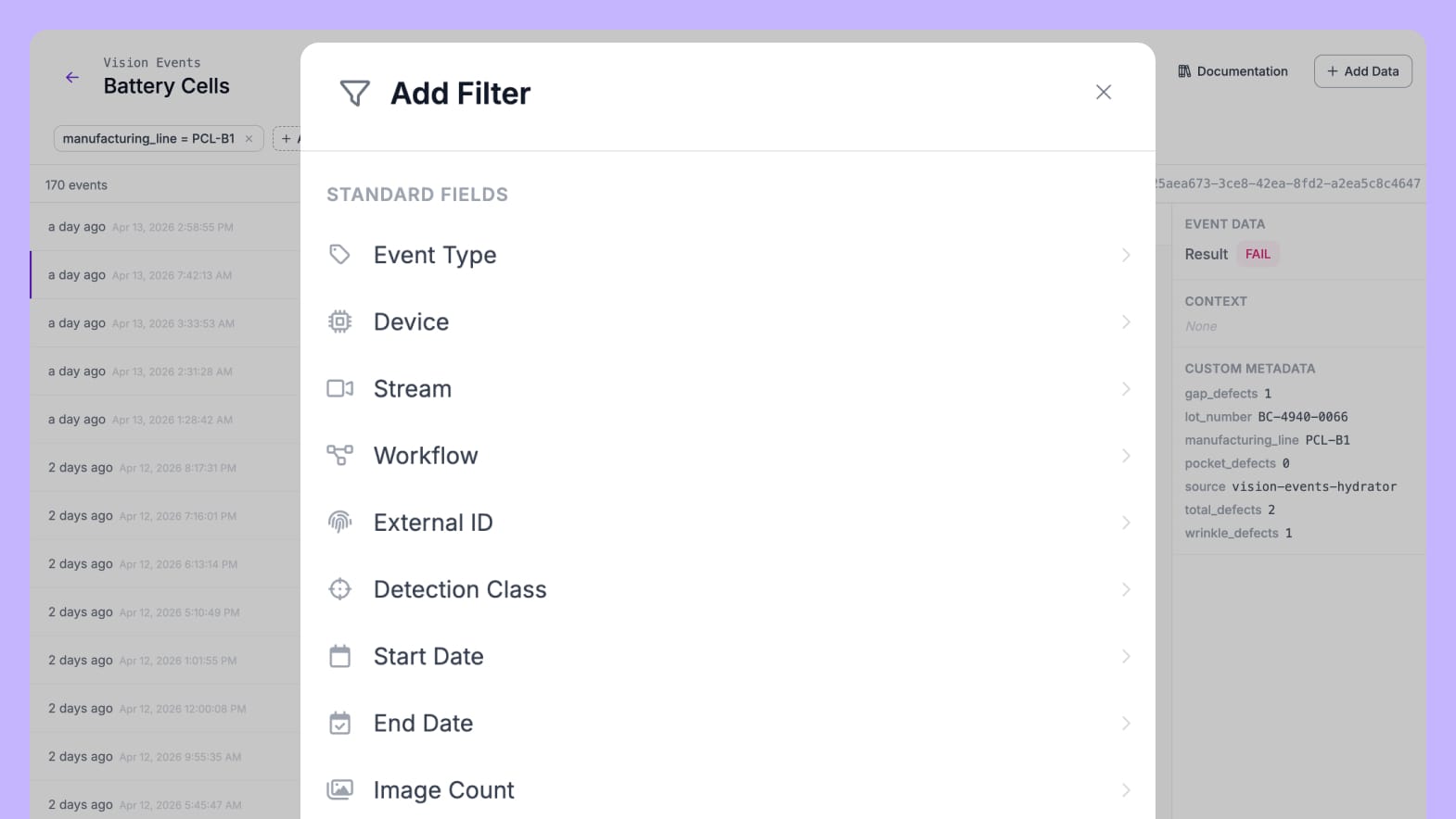 If you need to review specific information, you can filter your data by a wide range of properties, view the results, and save those filters for easy access later. This makes it easy to not only review the overall performance of your model, but also pinpoint specific events when necessary. For example, if you are tracking quality issues in a battery manufacturing facility and need to review images from a specific time, assembly line, or range of serial numbers, you can filter by the relevant metadata to quickly locate the exact information you need.