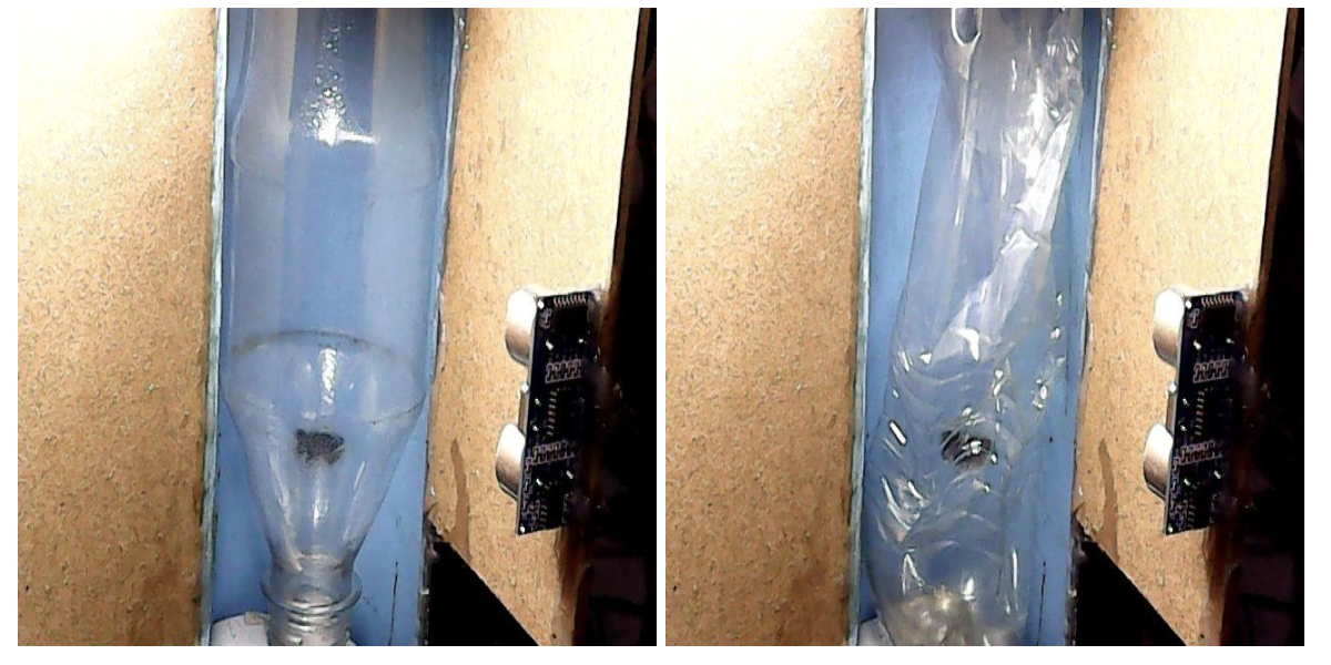 "Condensation or water droplets are present inside the upper part of the plastic bottle."