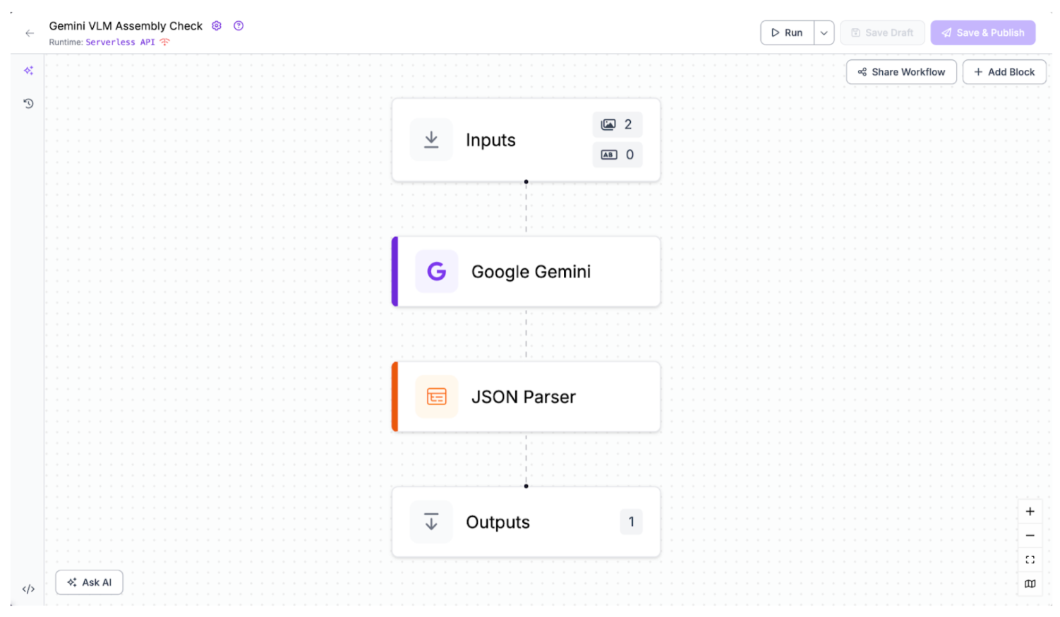 Roboflow Workflows extends vision systems beyond raw predictions by producing structured, decision-ready outputs. This tutorial uses a Roboflow Workflow with a single Google Gemini block that takes a reference image and a product image as inputs, compares them, and produces a structured JSON output with a pass/fail verdict and detailed discrepancy descriptions. Here's the finished workflow.