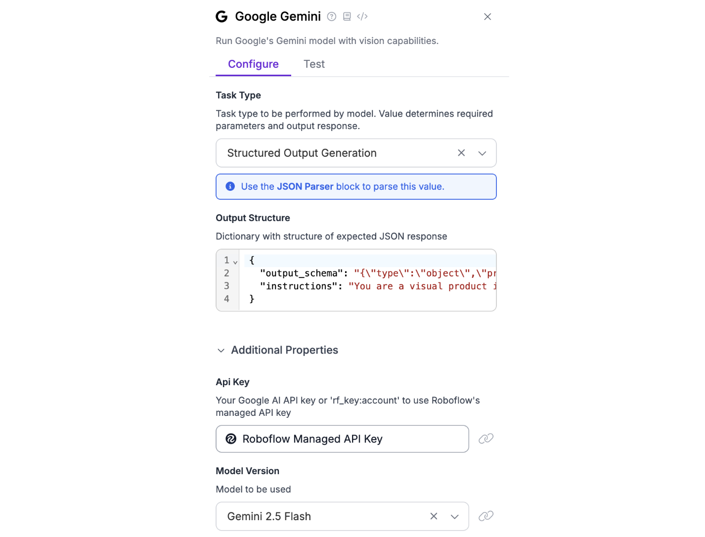 Once the Gemini block produces its structured output, the next step is extracting the relevant fields using a JSON Parser block, ensuring each key piece of information is cleanly separated and ready for downstream workflow steps.