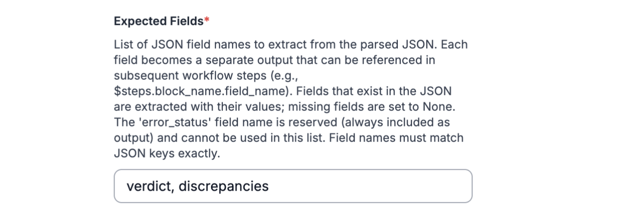 verdict, discrepanciesEach extracted field becomes a separate, addressable output that can be referenced by downstream workflow steps, such as logging, triggering alerts, or conditional branching.