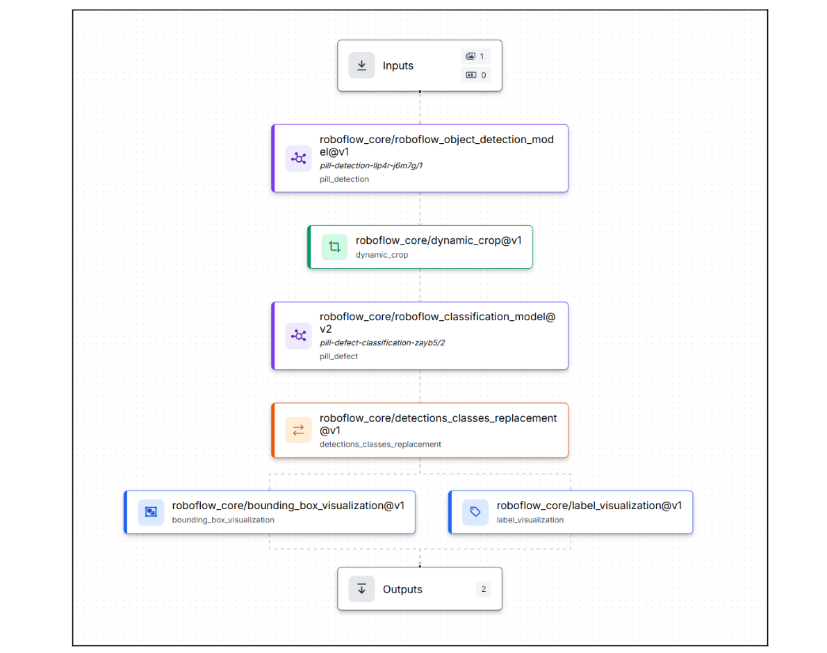 This is where two separate models become one inspection system. Roboflow Workflows connects detection, cropping, and classification into a single pipeline that processes each pill independently and outputs a pass/fail verdict.