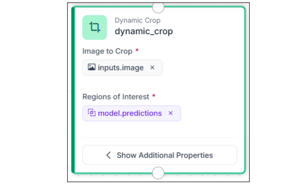 Add a Dynamic Crop block after the Object Detection model. This is the key connector in any two-stage workflow; it takes the detection bounding boxes and crops each detected pill into its own image. If the model detects 5 pills in one frame, you get 5 separate cropped images. Instead of the classification model seeing the entire production frame, with conveyor-belt texture, other pills, and background noise, it sees a clean, centered view of one pill at a time.