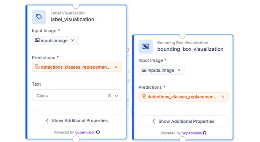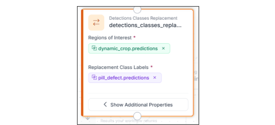 Add a Detections Classes Replacement block. This replaces the generic pill label from Stage 1 with the actual classification result from Stage 2. Now each bounding box carries the inspection verdict: the detection tells you where, and the classification tells you what.