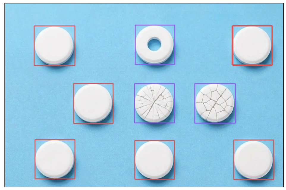 This per-pill granularity is what separates a real inspection system from a frame-level binary classifier. Each pill gets its own verdict and a bounding box in the output.