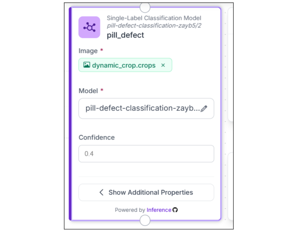 Each cropped pill image is classified independently, and the model returns a class label (Normal or Edge Defect) and a confidence score for each. Because the Dynamic Crop block already isolated the pill, the classifier sees only the pill with no surrounding context, which significantly improves classification accuracy compared to running classification on the full frame.