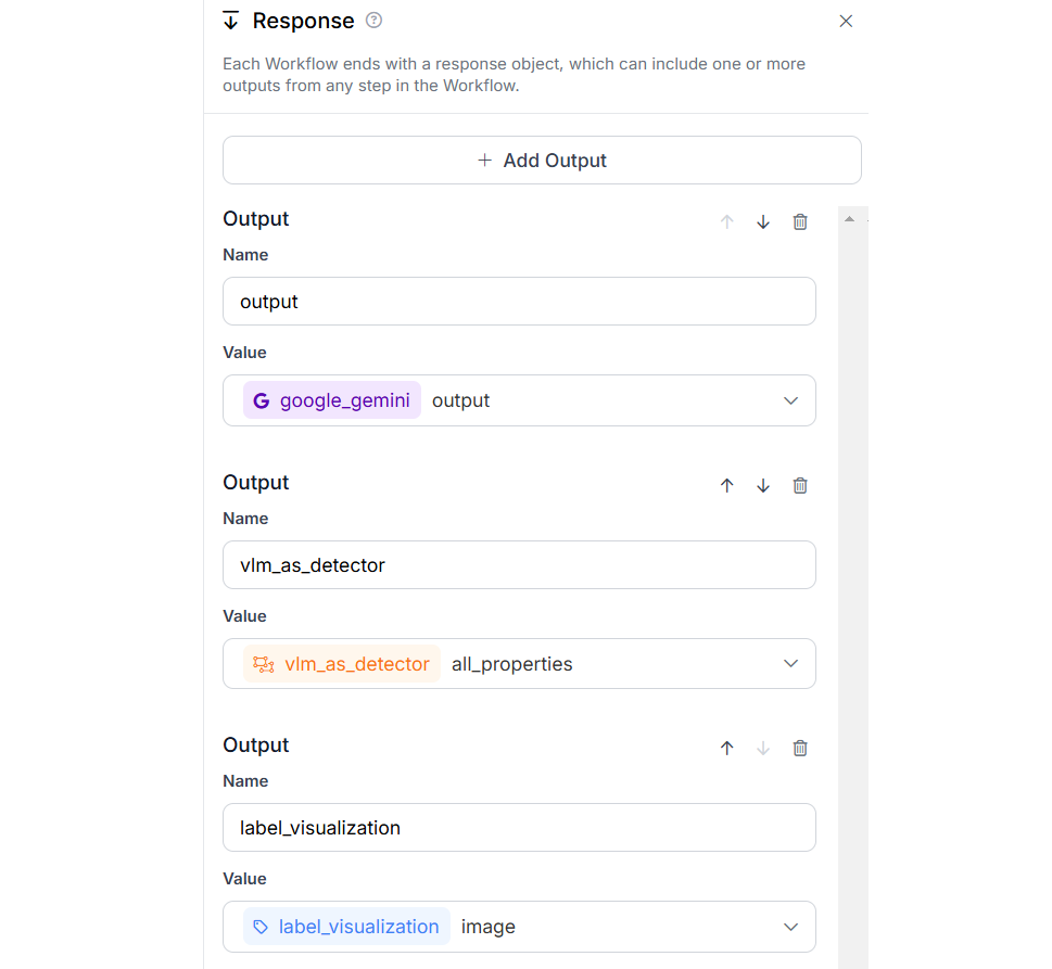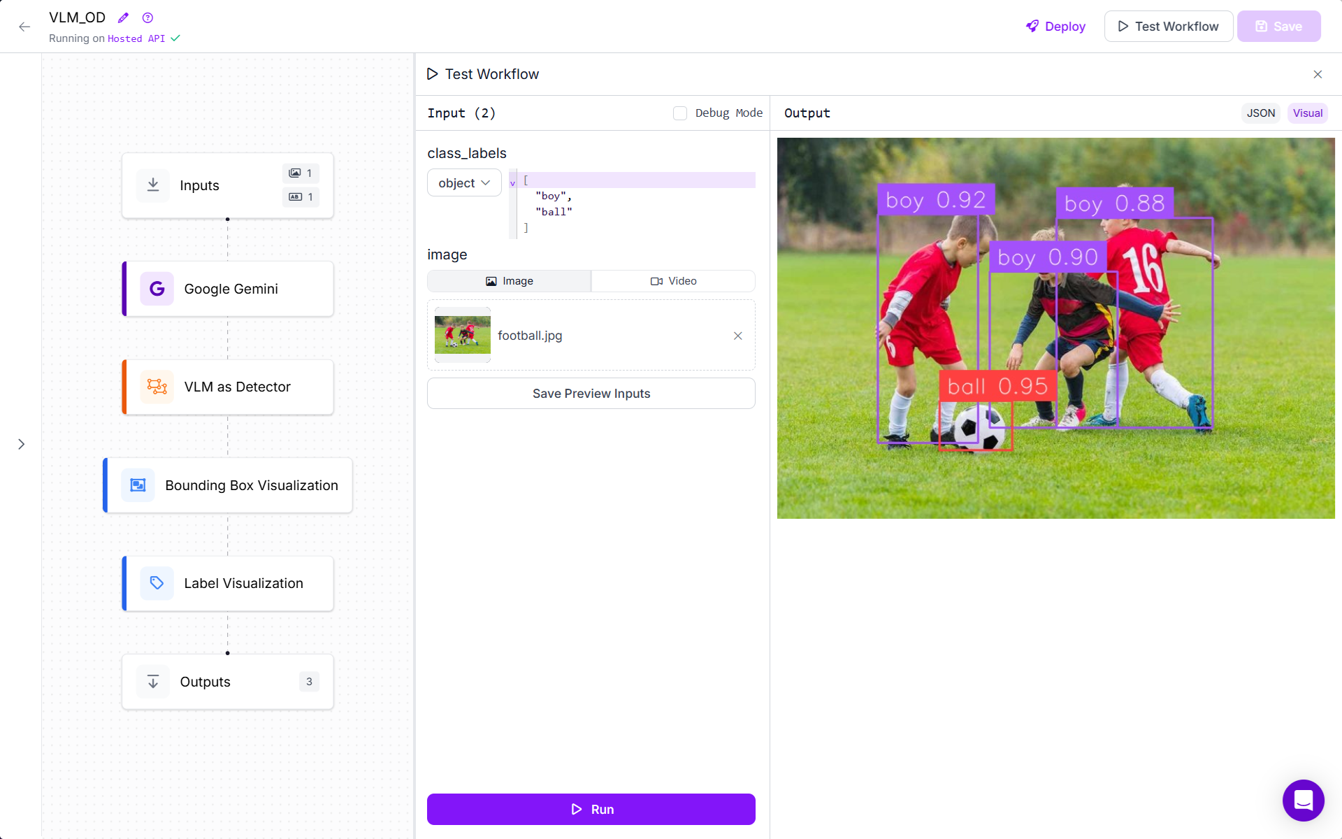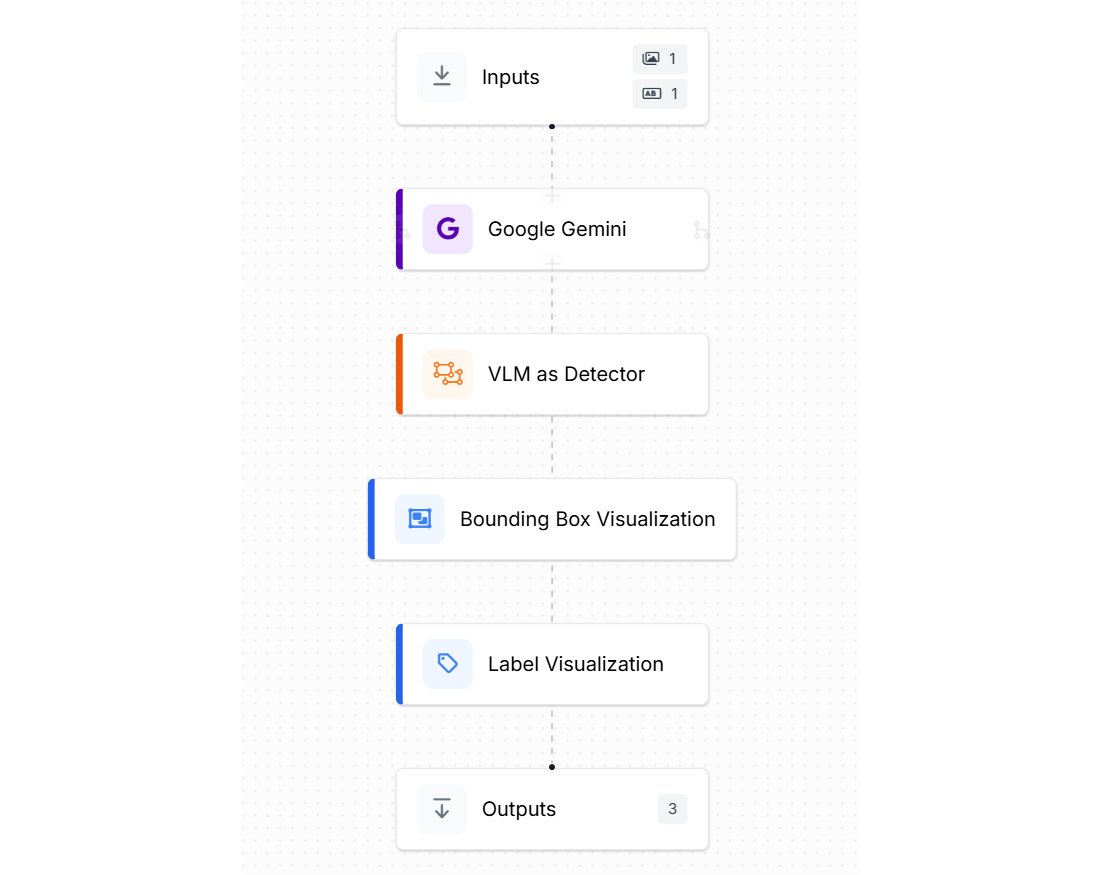 To showcase object detection using a VLM, we will use the Google Gemini model with Roboflow Workflows, as such: