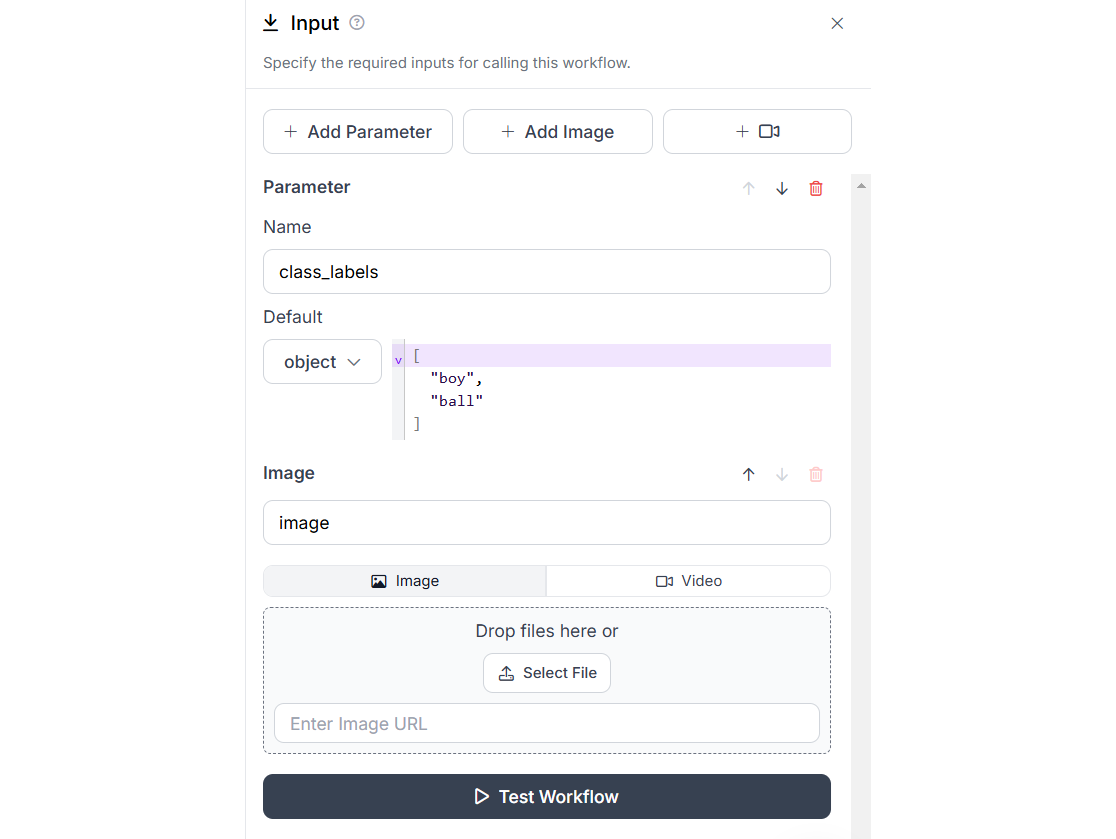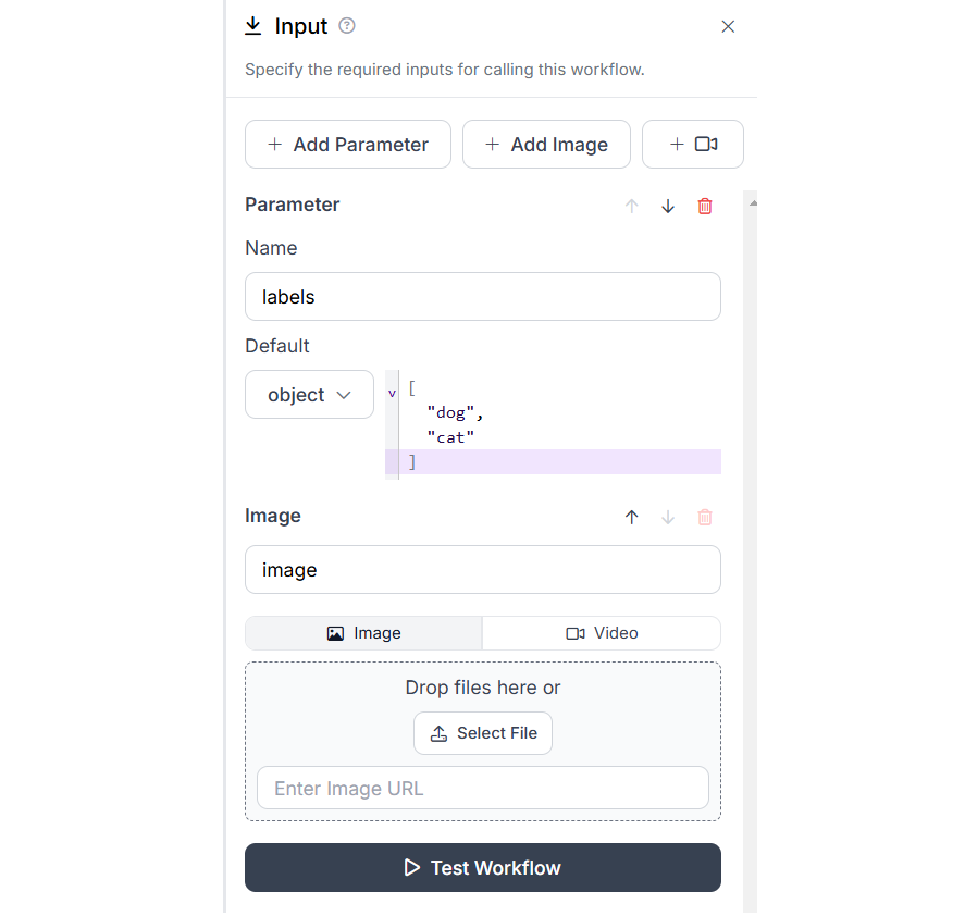Now we will see the configurations for each blocks. The Input block should be configured to accept class labels in the “labels” parameter and image in the “image”. I have also specified the two default classes in my “labels” parameter as a python List object.