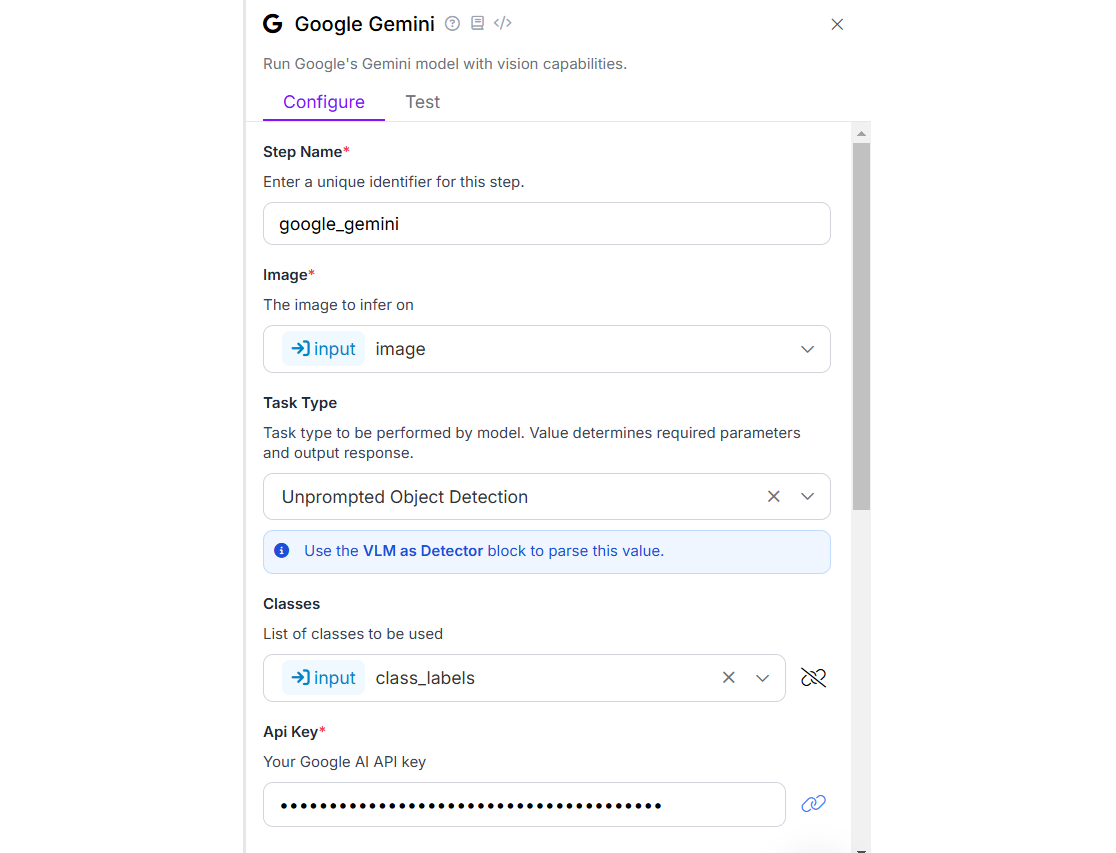 Add the Google Gemini, VLM as Detector and Label Visualization and Bounding Box Visualization blocks to your workflow. We will use Google Gemini for the task type “Unprompted Object Detection” as we want to detect the object by specifying class labels only in input block. Here is the configuration for Google Gemini block.