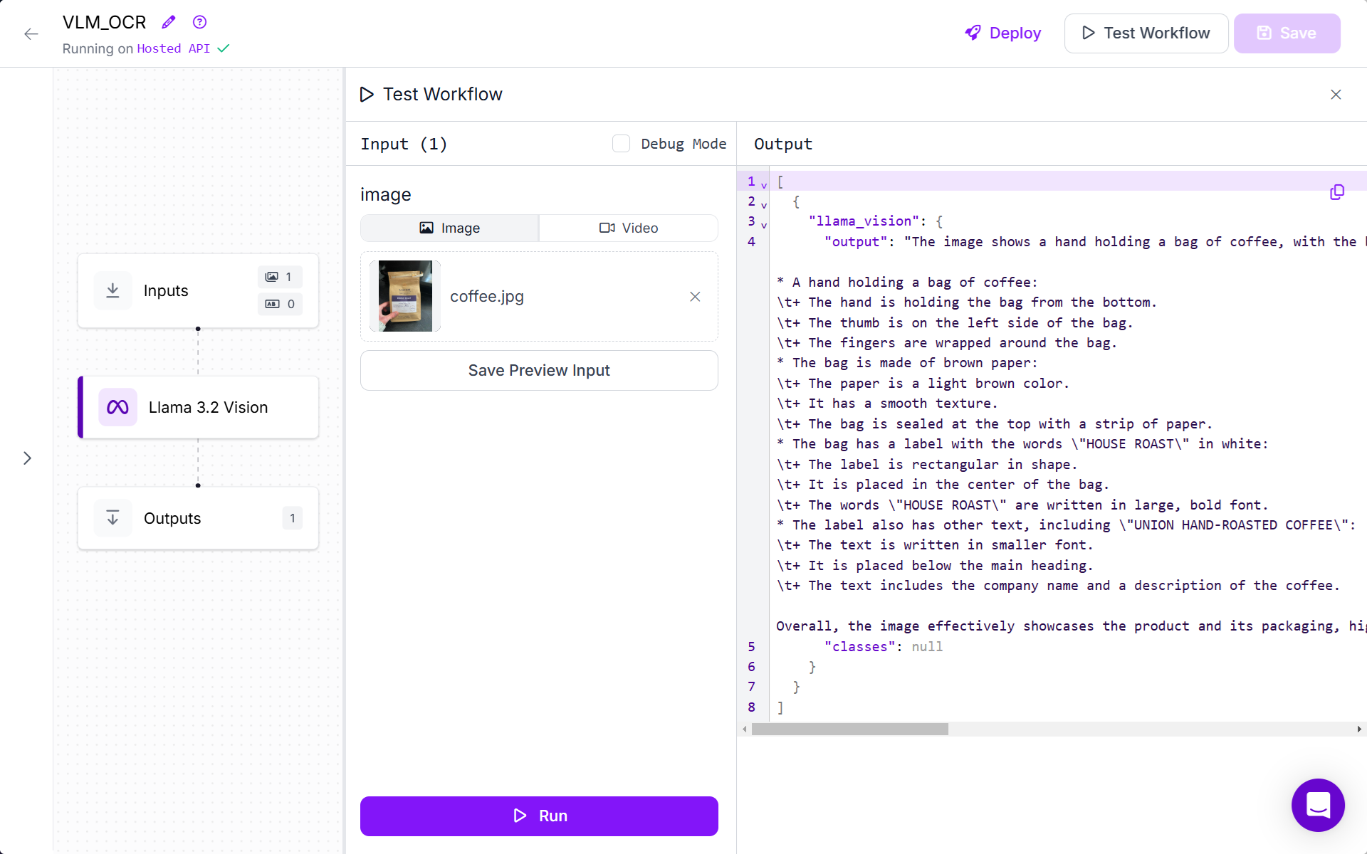 Run the Workflow, add question and upload the image. You will see the following output.